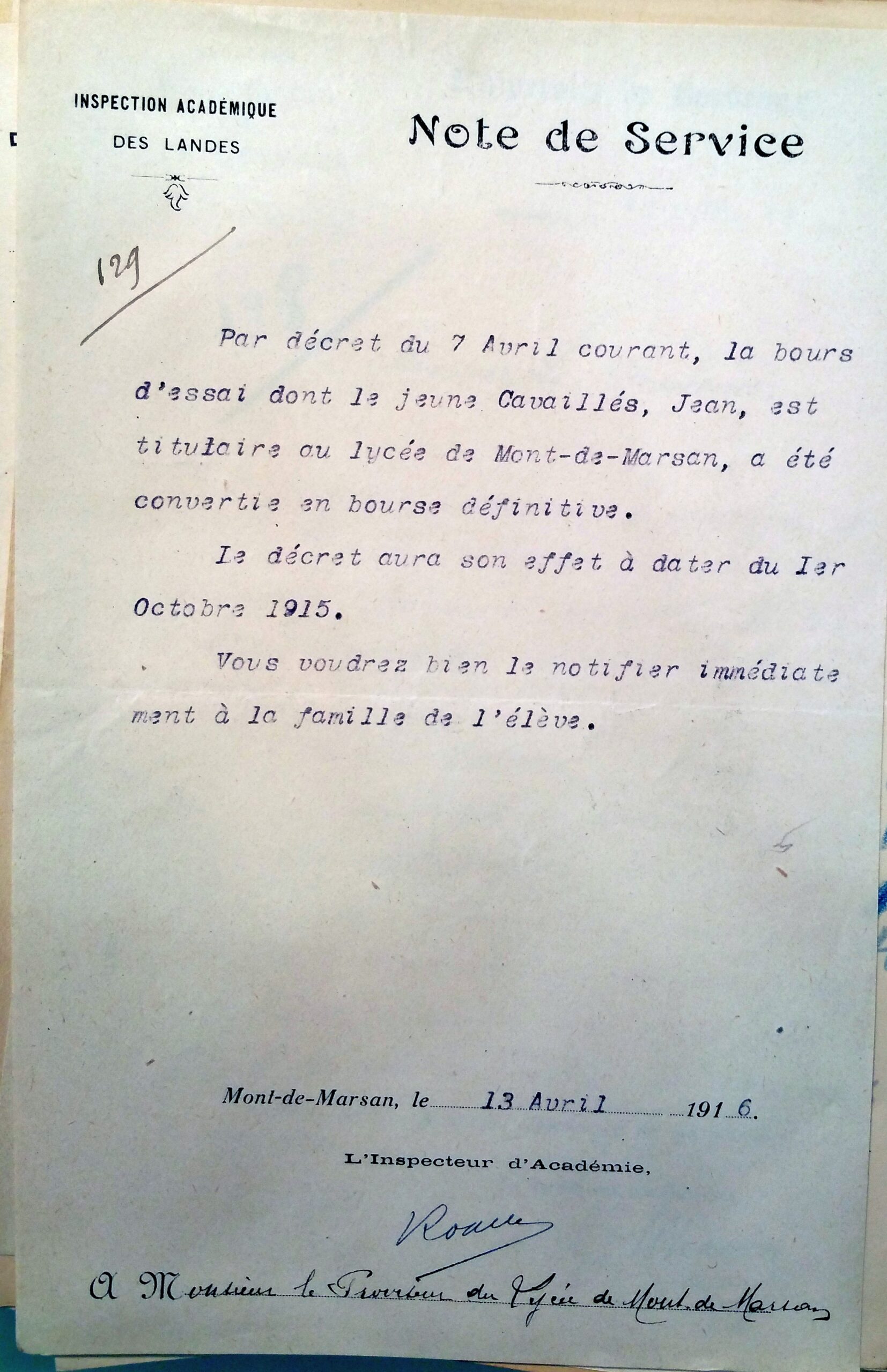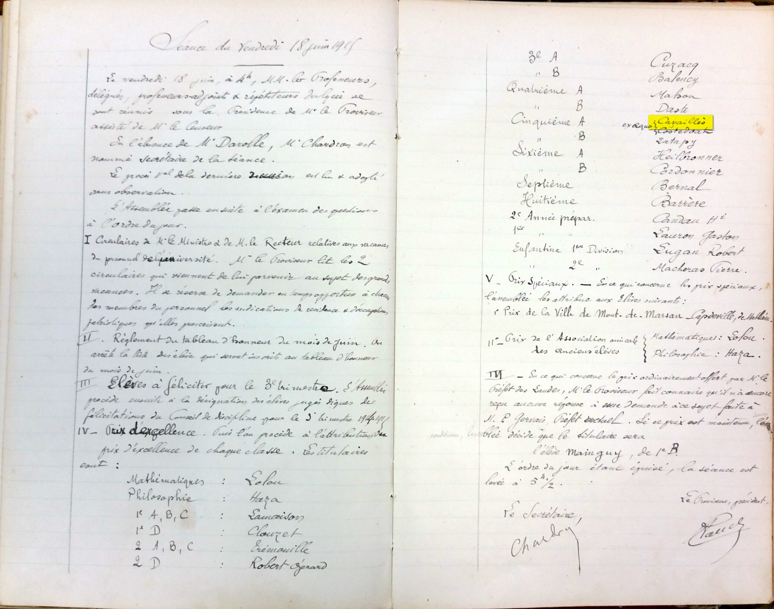 - Année scolaire 1915-1916 (Classe de 4e A, malade ?) : Accessit du Conseil de Discipline