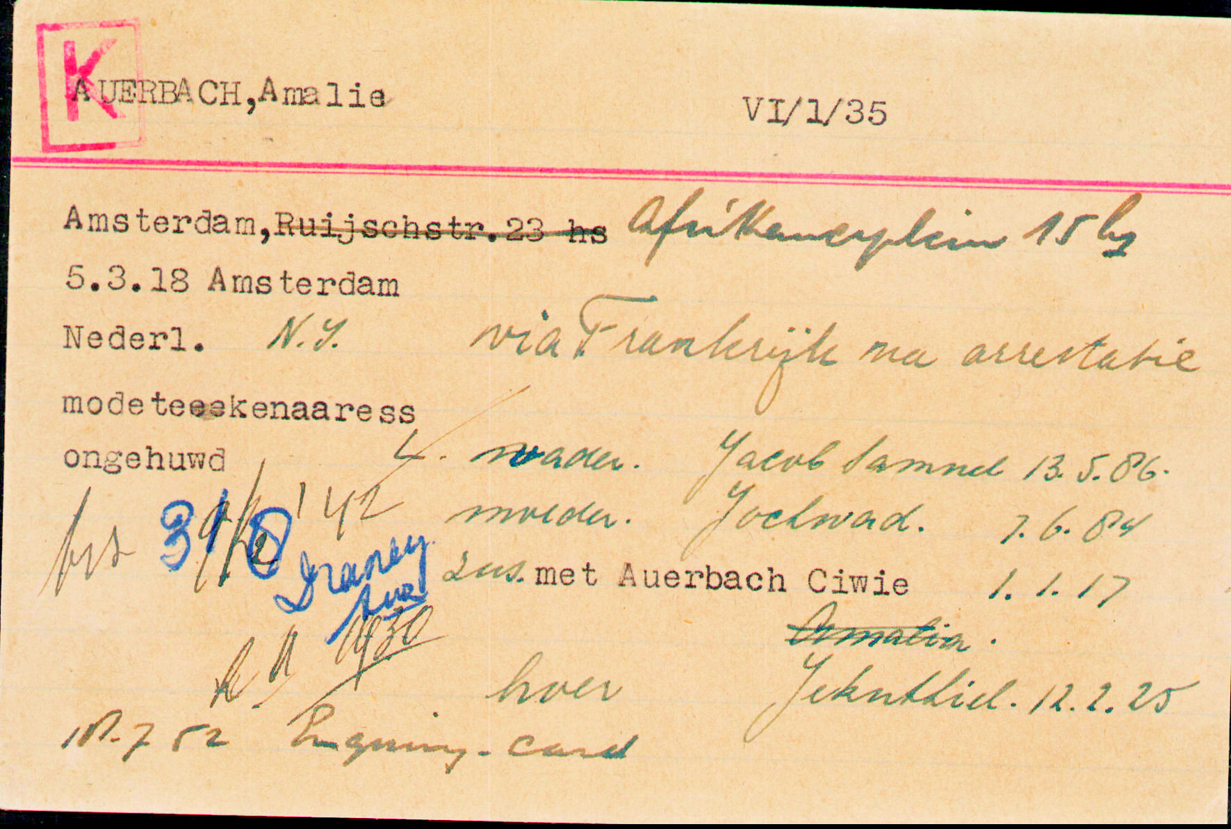 Une collègue d’Amalia, Irma REINSBERG, est née en 1914 en Allemagne. En tant que femme juive, elle s’était vu refuser l’entrée à l’université. Venue à Amsterdam en 1933, elle devient modiste et épouse en 1936 son cousin Erich REINSBERG, communiste ayant fui l’Allemagne également en 1933, créateur d’une fabrique de vêtements.