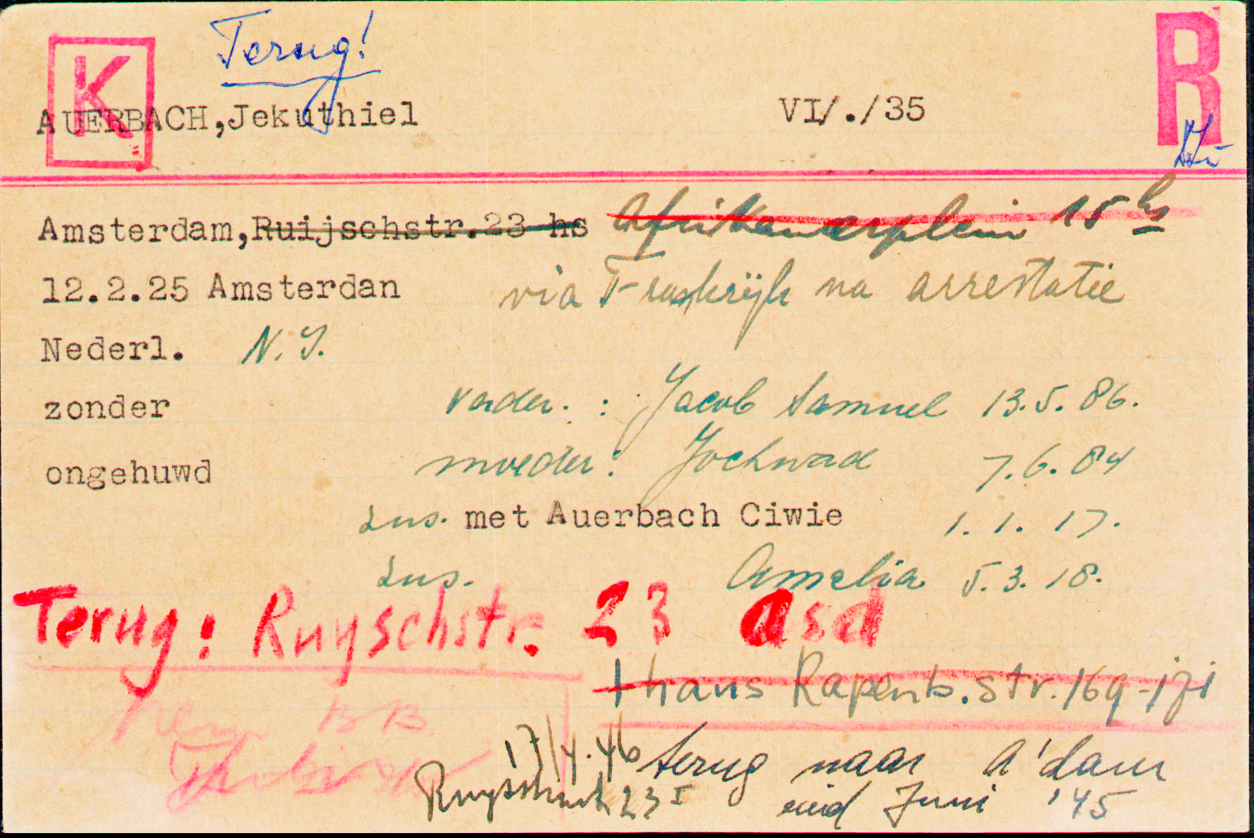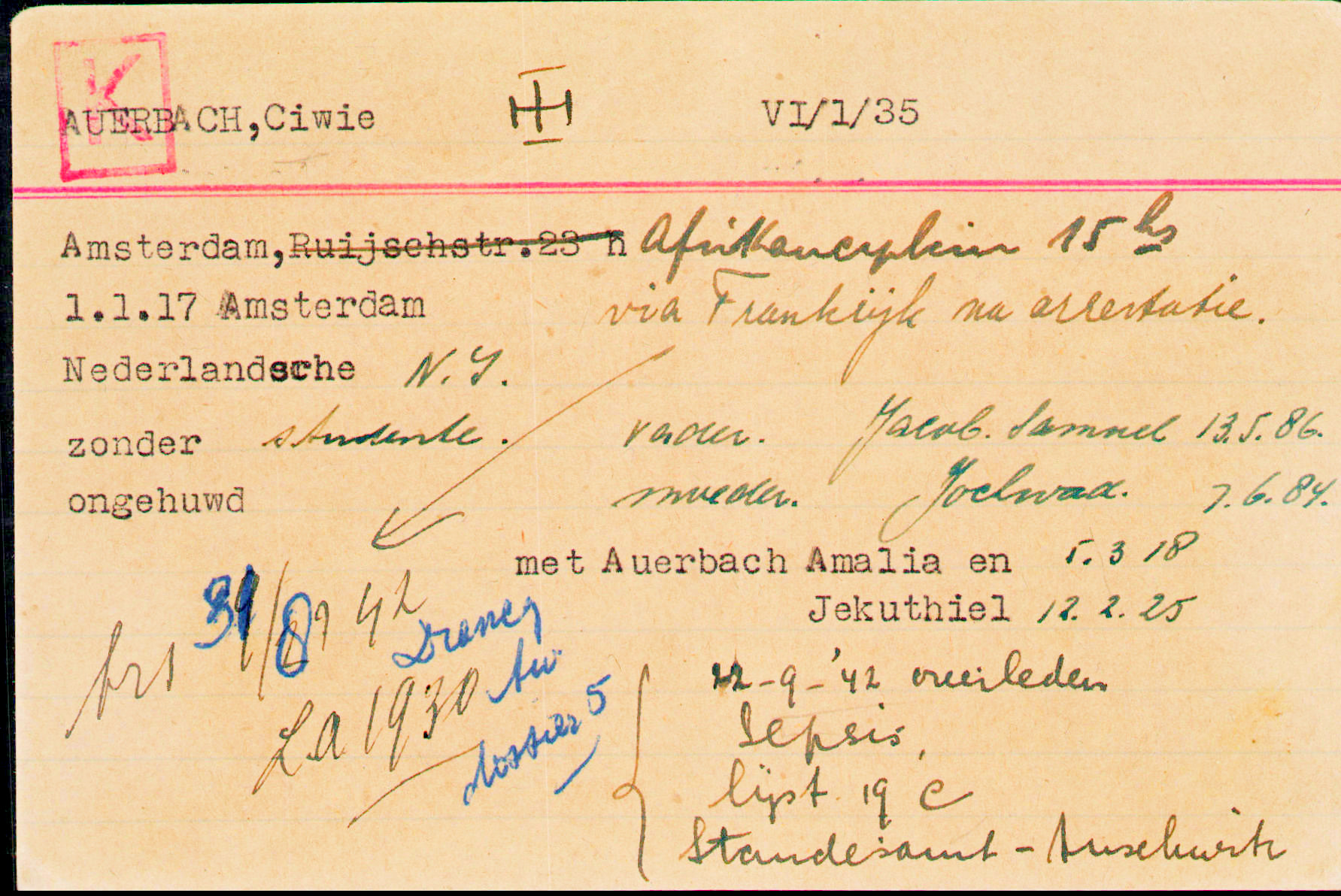 Amalia est déclarée décédée le 3 septembre 1942 [1]In Memoriam – Nederlandse oorlogsslachtoffers, mais sans nouvelles d’elle, son père poursuit les recherches jusqu’en 1952 au moins. Ciwie est décédée le 22 septembre 1942 [2]Auschwitz Death Registers.