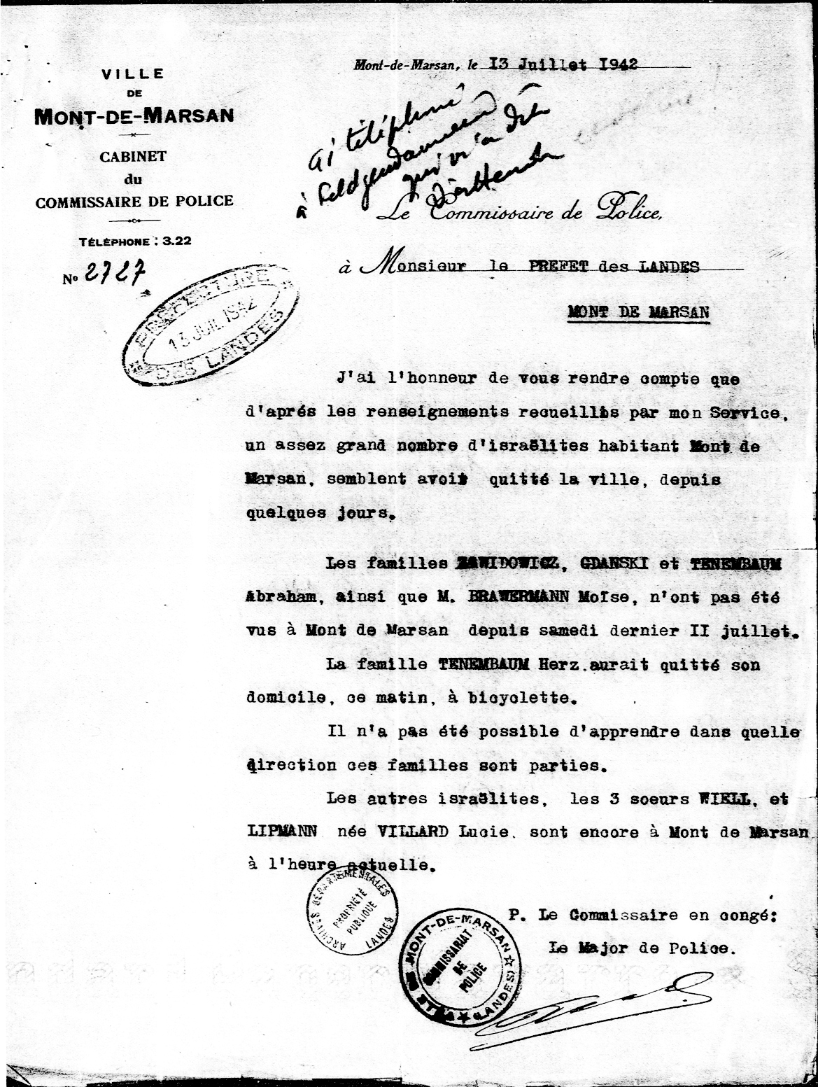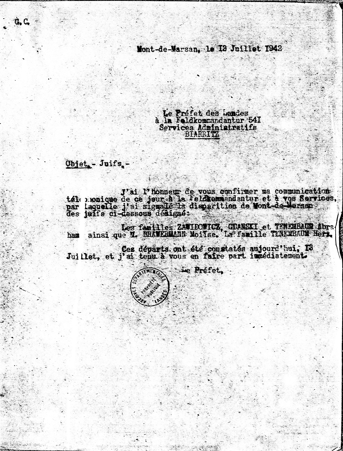 Sans doute averti de la rafle en préparation (les 14, 15 et 16 juillet 1942 dans l’arrondissement de Dax), il quitte Mont-de-Marsan entre le 11 et le 13 juillet 1942 (comme le font les ZAWIDOWICZ, TENEMBAUM, GDANSKI, etc.). Informé par le commissaire de Police, le préfet se couvre immédiatement auprès de la feldkommandantur (il avait en effet un peu tardé à signaler un départ précédent en juin, ce qui lui avait valu de fortes remontrances de la part des autorités allemandes)…
