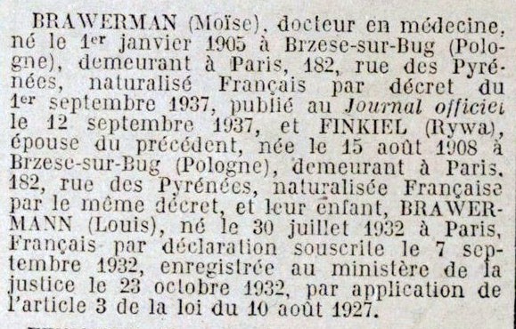 Enfin le 24 novembre, la 3e sous-commission, dans sa 488e séance, émet un avis de retrait de la nationalité française pour Moïse, son épouse Rywa (décédée depuis le mois d’août), et leur fils Louis, né le 30 juillet 1932 à Paris XXe, français par déclaration le 23 octobre 1932.
