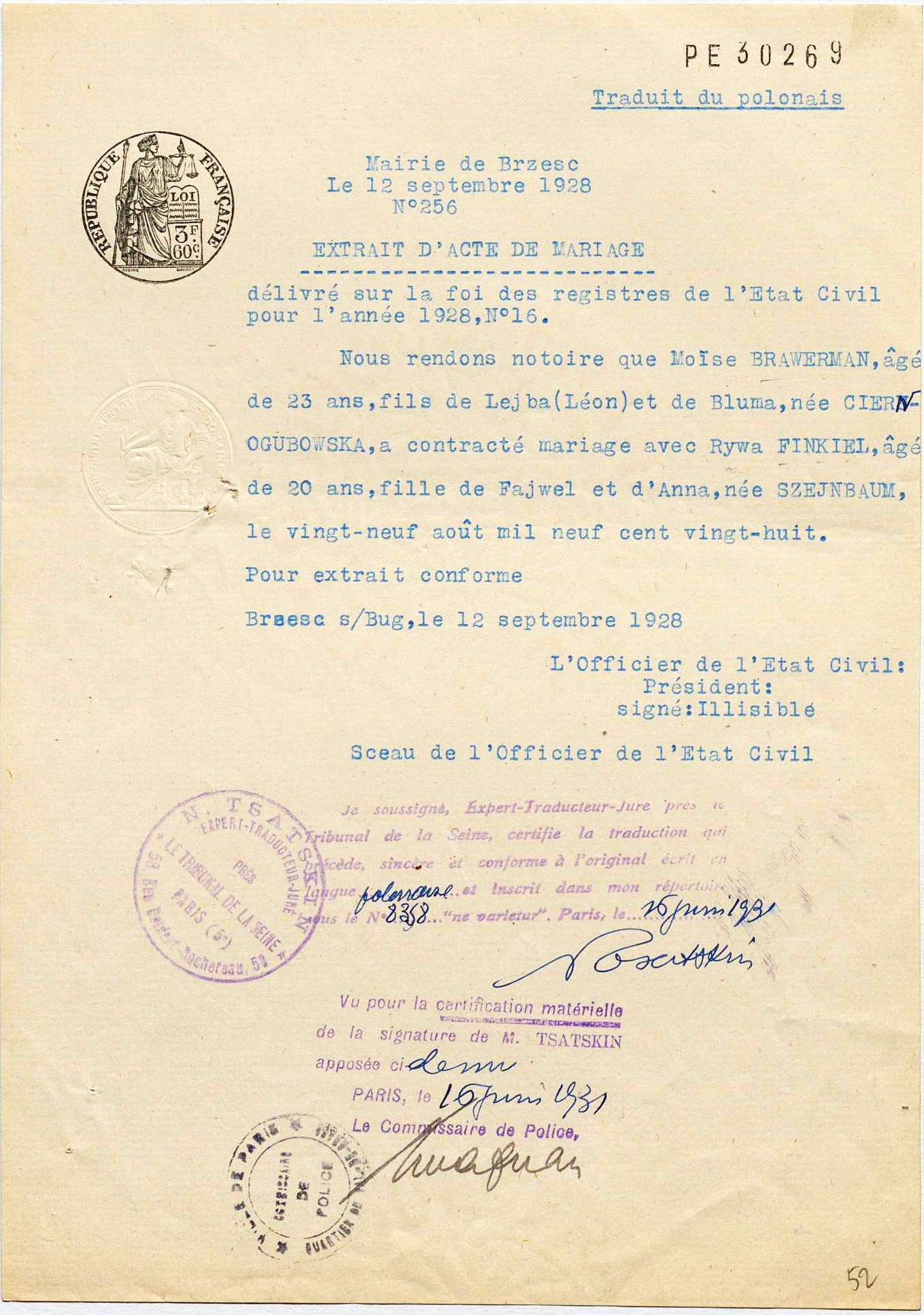 Il fait un aller-retour au pays pour épouser une compatriote le 29 août 1928 à Brest, Rywa FINKIEL, née le 15 août 1908 dans cette ville (elle est décédée le 20 août 1941 à leur domicile à Paris), ouvrière d’art jusqu’à la naissance de son fils, puis sans profession. Elle « parle difficilement le français », nous apprend son dossier de naturalisation.