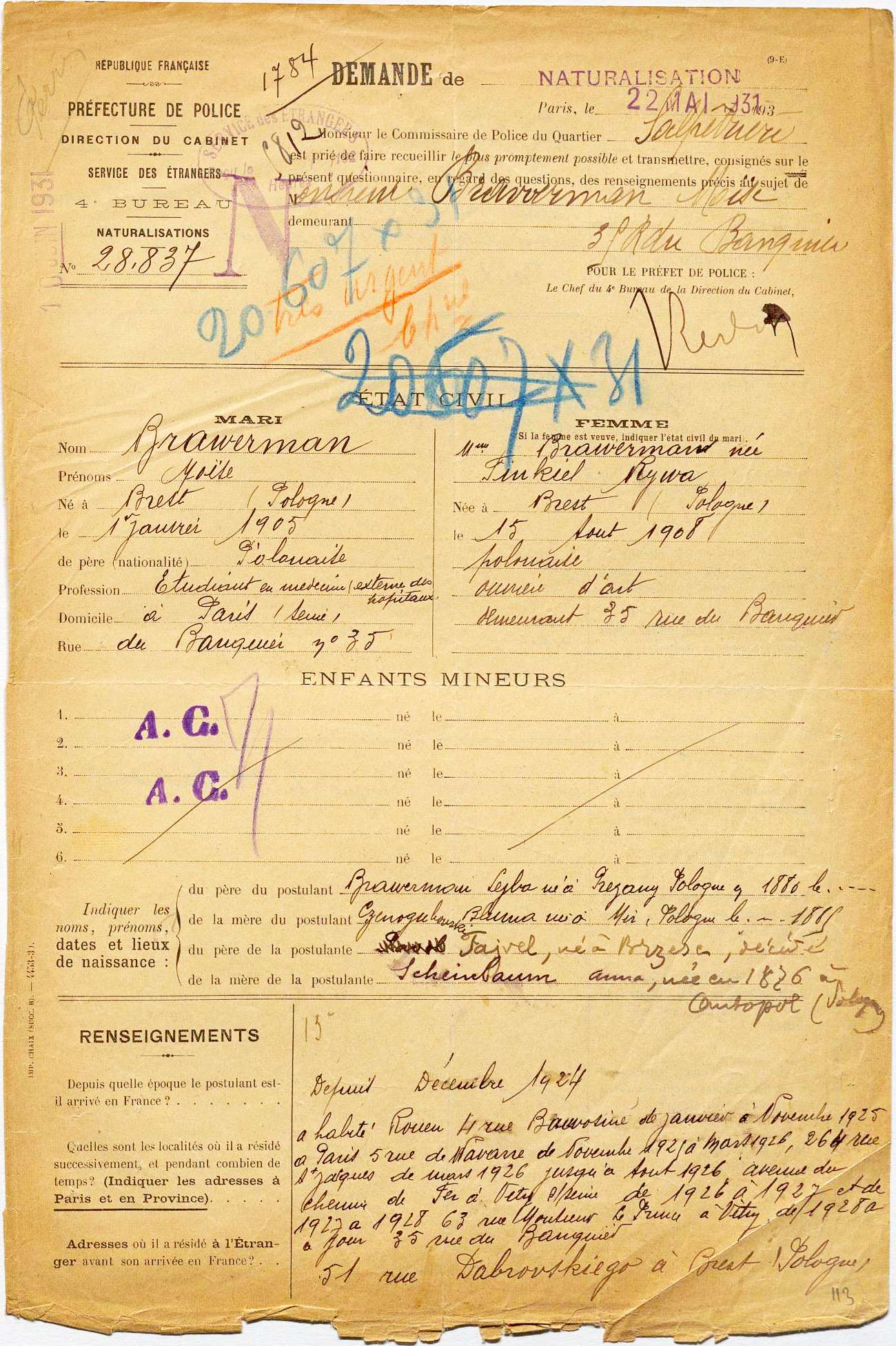 Nous nous sommes intéressé au dossier de Moïse BRAWERMAN. Il comporte 127 pages (!), avec ses différentes demandes de naturalisation ainsi que le dossier de dénaturalisation.