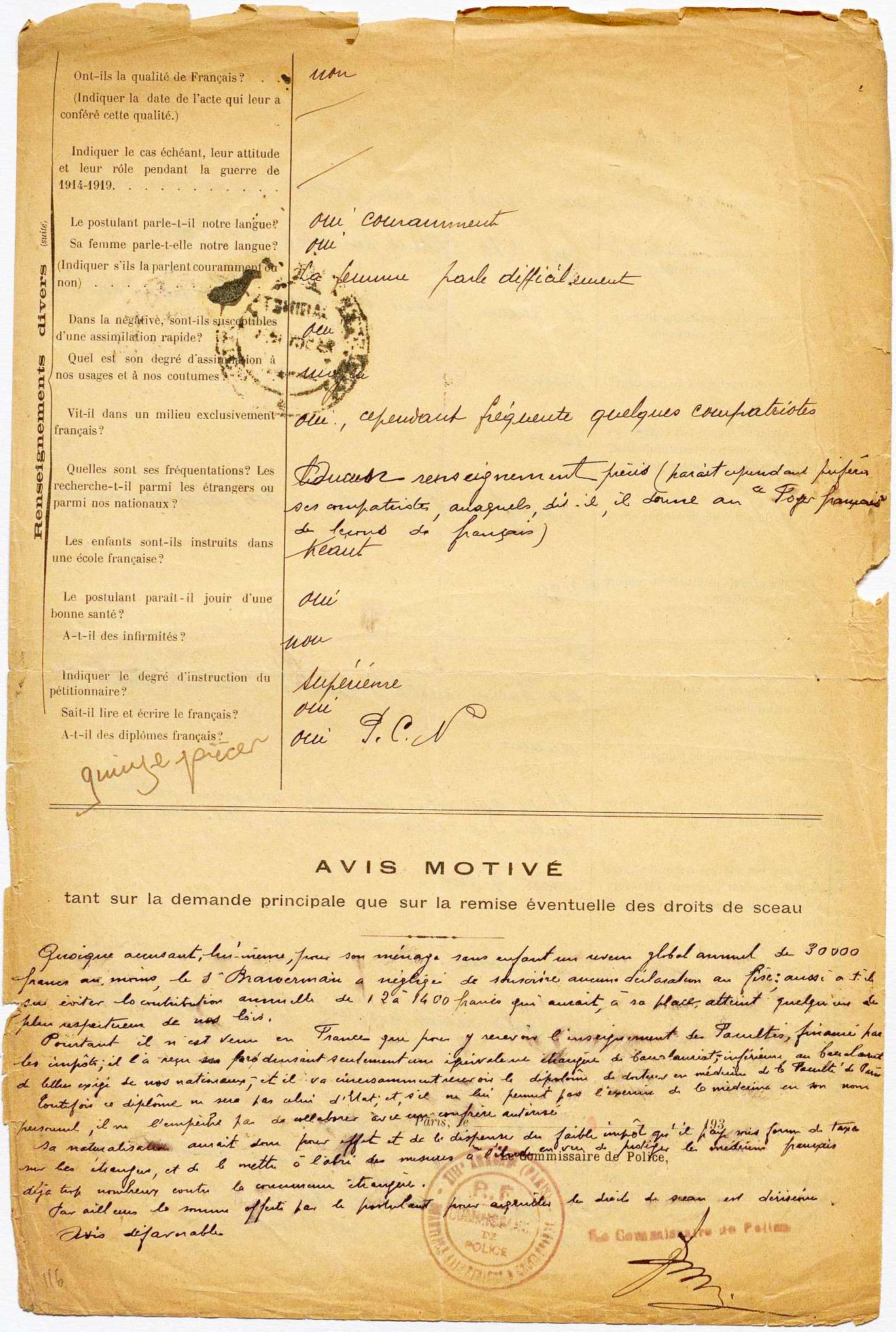 Sa naturalisation aurait donc pour effet et de le dispenser du faible impôt qu’il paye sous forme de taxe sur les étrangers, et de le mettre à l’abri des mesures à l’étude en vue de protéger les médecins français déjà trop nombreux contre la concurrence étrangère.