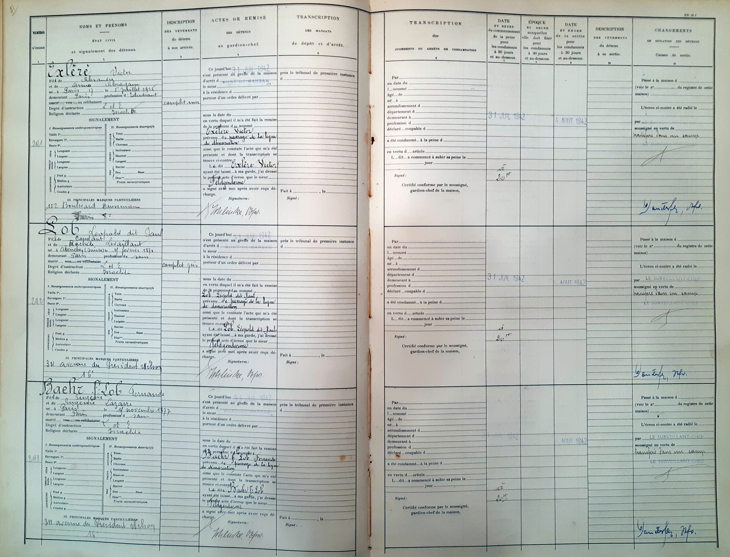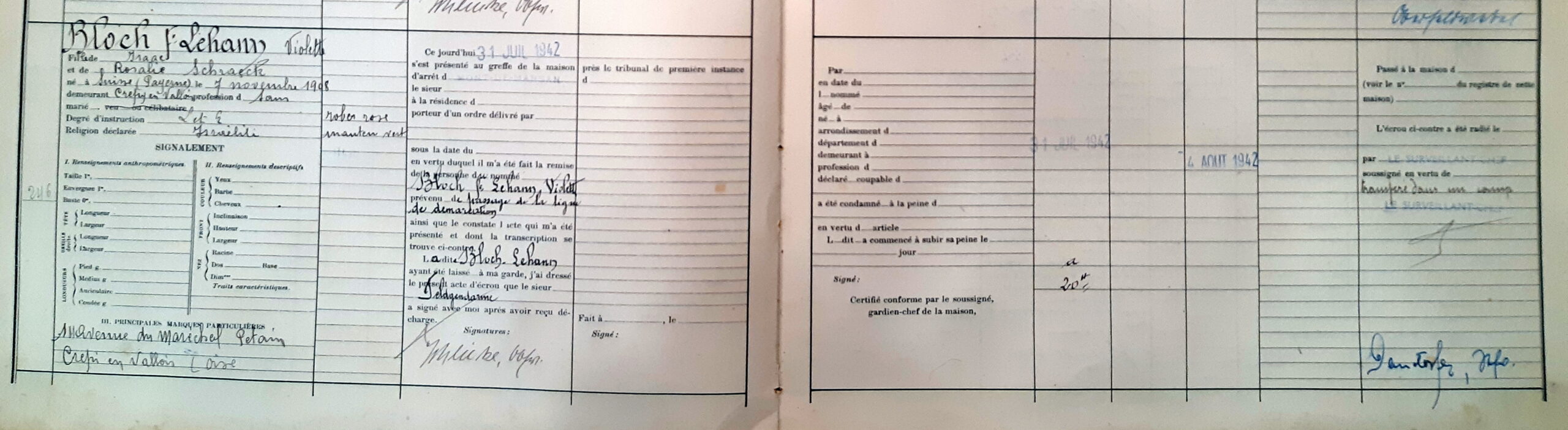Le 31 juillet 1942 vers 20 heures, Odette FABIUS, née SCHMOLL, est en effet amenée par le feldgendarme Schlinke et incarcérée. Elle est vêtue d’un tailleur gris et dite domiciliée Villa Sacha, rue de la Frégate à Biarritz, et le greffier indique comme profession « Croix Rouge » et comme religion « cath ». Elle est accompagnée des époux LÖB (71 et 64 ans), de Violette LEHMANN, et de M. EXLERE, avec ses deux enfants. Tous sont parisiens.
