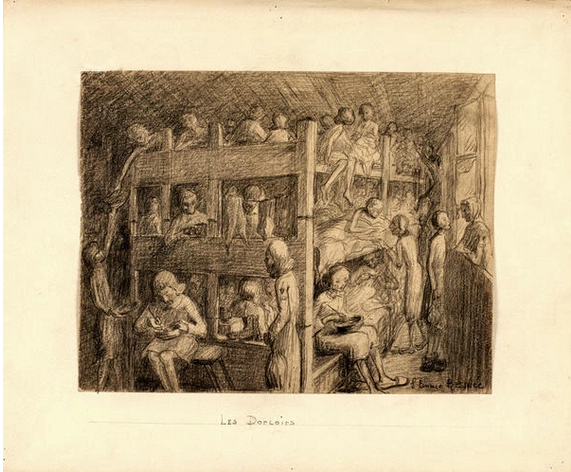 Des femmes, sans âge défini, jeunes, vieilles, quelques-unes très vieilles, en costumes rayés bleu et gris, semblaient à nos yeux, encore inaccoutumés à une telle misère physique, des personnages évadés des tableaux de l’Apocalypse.