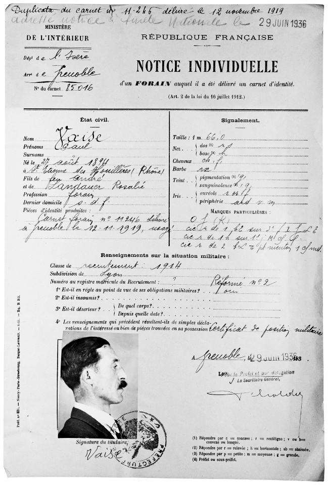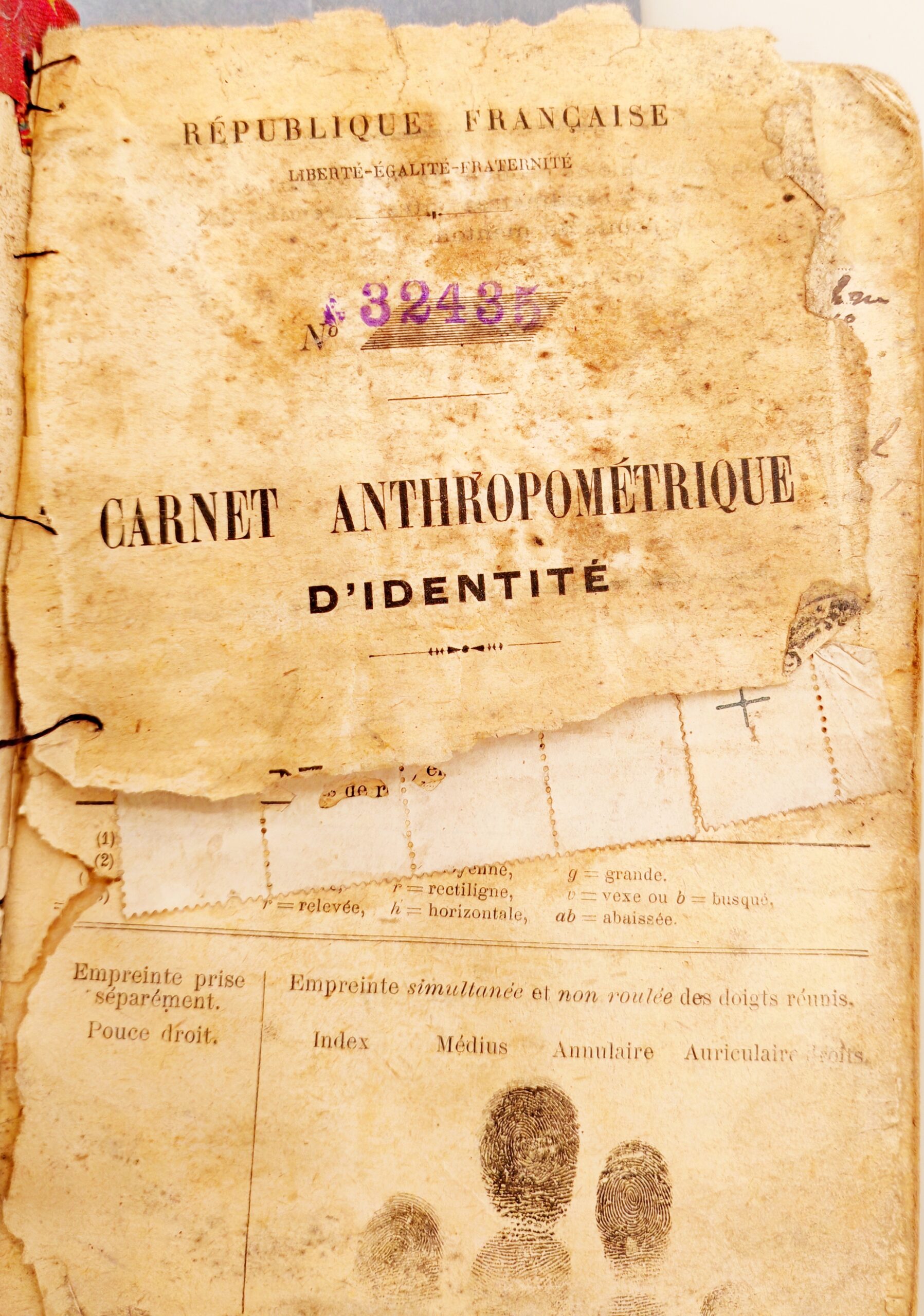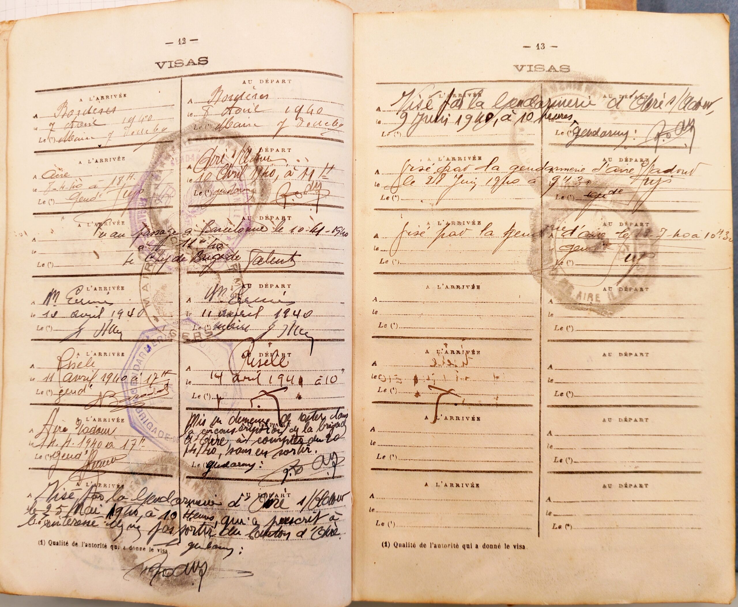 Le 21 mars 1940, à Saucats (Gironde), ayant négligé de faire viser son carnet anthropométrique d’identité à son arrivée dans ladite localité ainsi qu’à son départ, il est arrêté en application de la Loi de 1912, interné le 22, et condamné le 18 avril 1940 par le Tribunal de première instance de Bordeaux à 8 jours de prison.