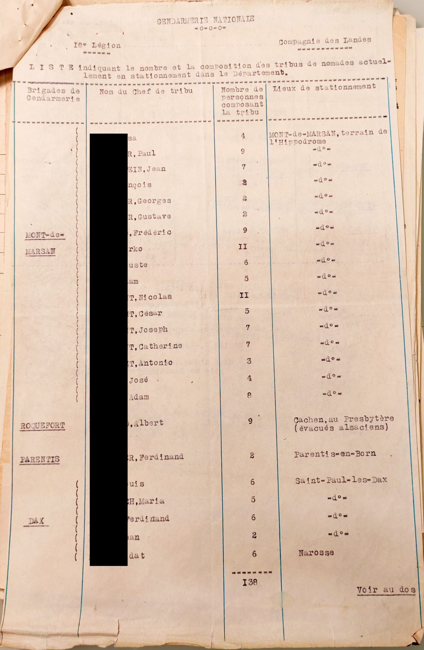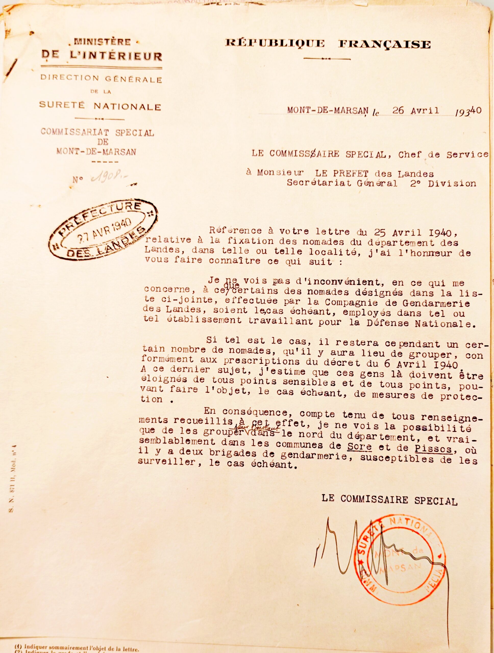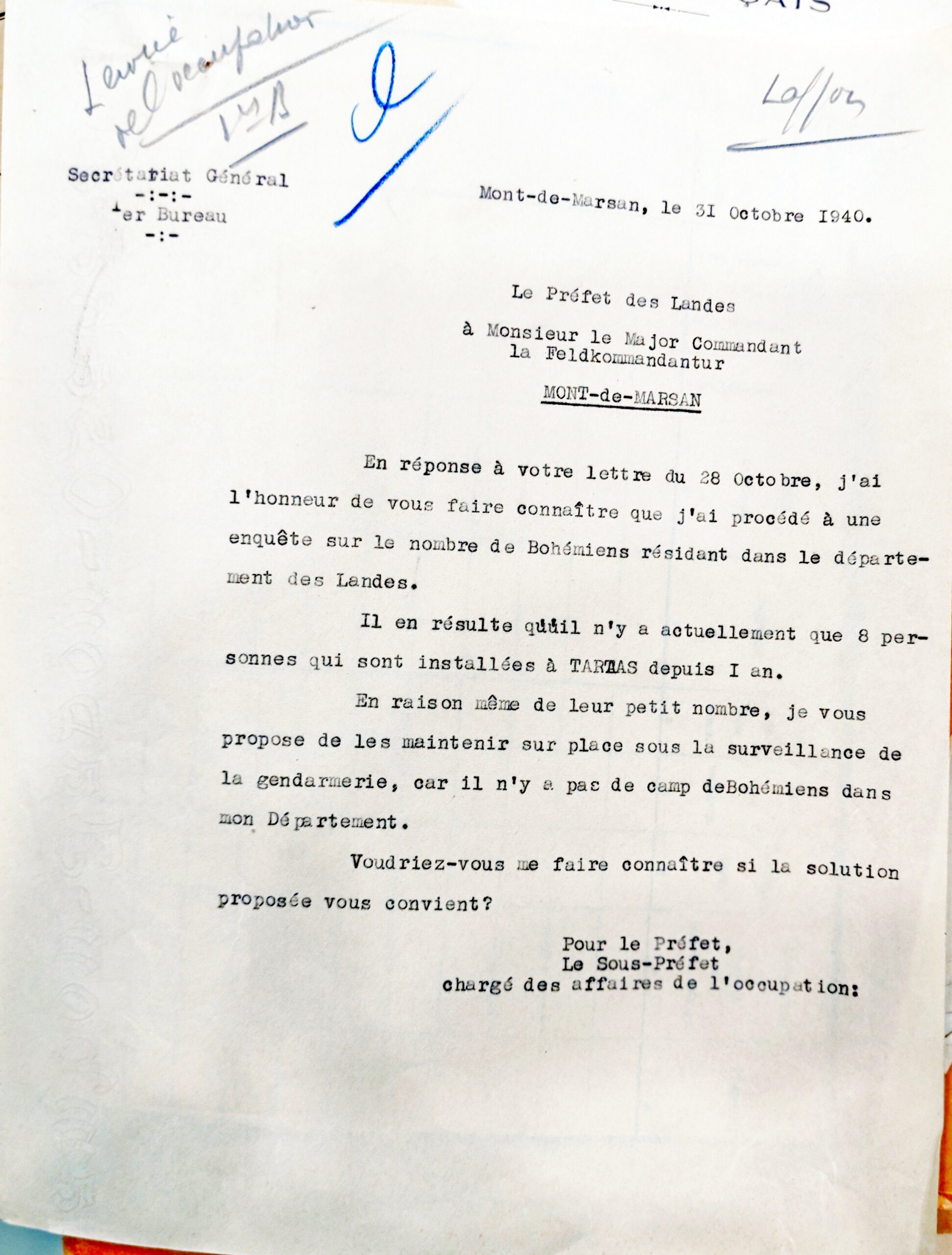Le préfet des Landes transmet alors à la kommandantur les résultats d’un recensement, qui ne décompte que sept Zigeuner (ce que l’interprète de la préfecture traduit par « Bohémiens »). Face à ce petit nombre, et compte tenu du fait qu’il n’y a pas de camp susceptible de les interner dans les Landes, il propose de ne pas les arrêter, mais de les maintenir sous surveillance, ce que la kommandantur accepte. Même s’ils sont 17 en février 1941 (6 Français et 11 Espagnols, regroupés en 3 familles), ils restent assignés à résidence.