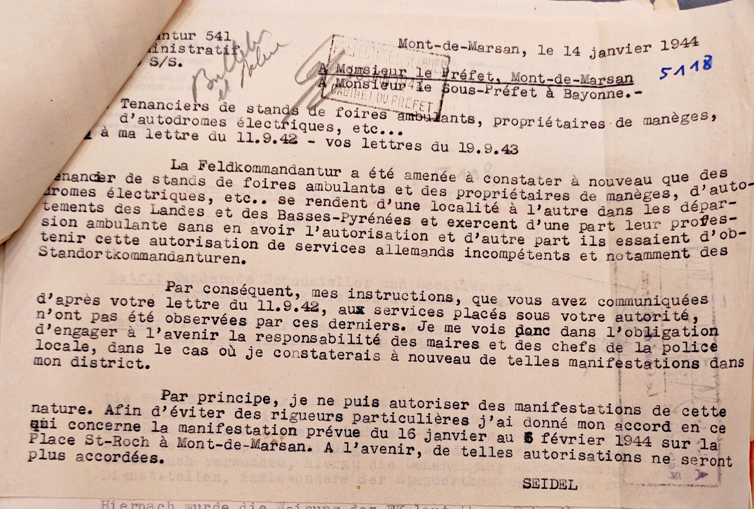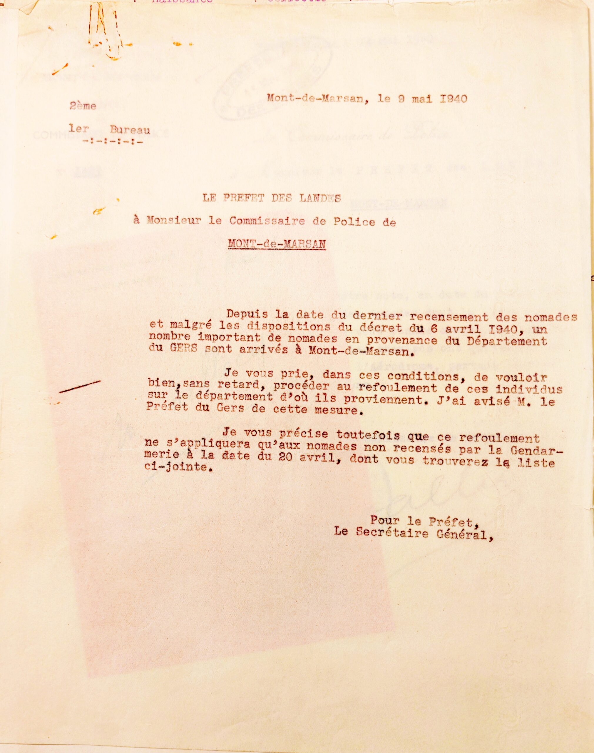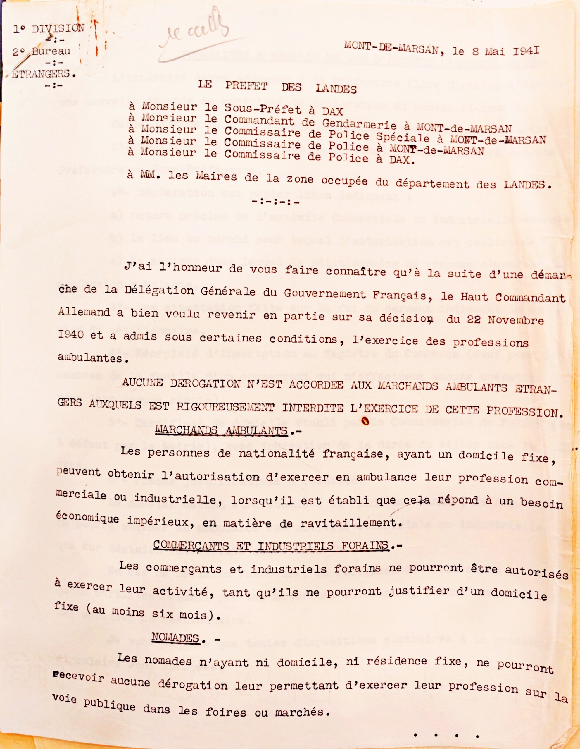 Le préfet des Landes transmet alors à la kommandantur les résultats d’un recensement, qui ne décompte que sept Zigeuner (ce que l’interprète de la préfecture traduit par « Bohémiens »). Face à ce petit nombre, et compte tenu du fait qu’il n’y a pas de camp susceptible de les interner dans les Landes, il propose de ne pas les arrêter, mais de les maintenir sous surveillance, ce que la kommandantur accepte. Même s’ils sont 17 en février 1941 (6 Français et 11 Espagnols, regroupés en 3 familles), ils restent assignés à résidence.