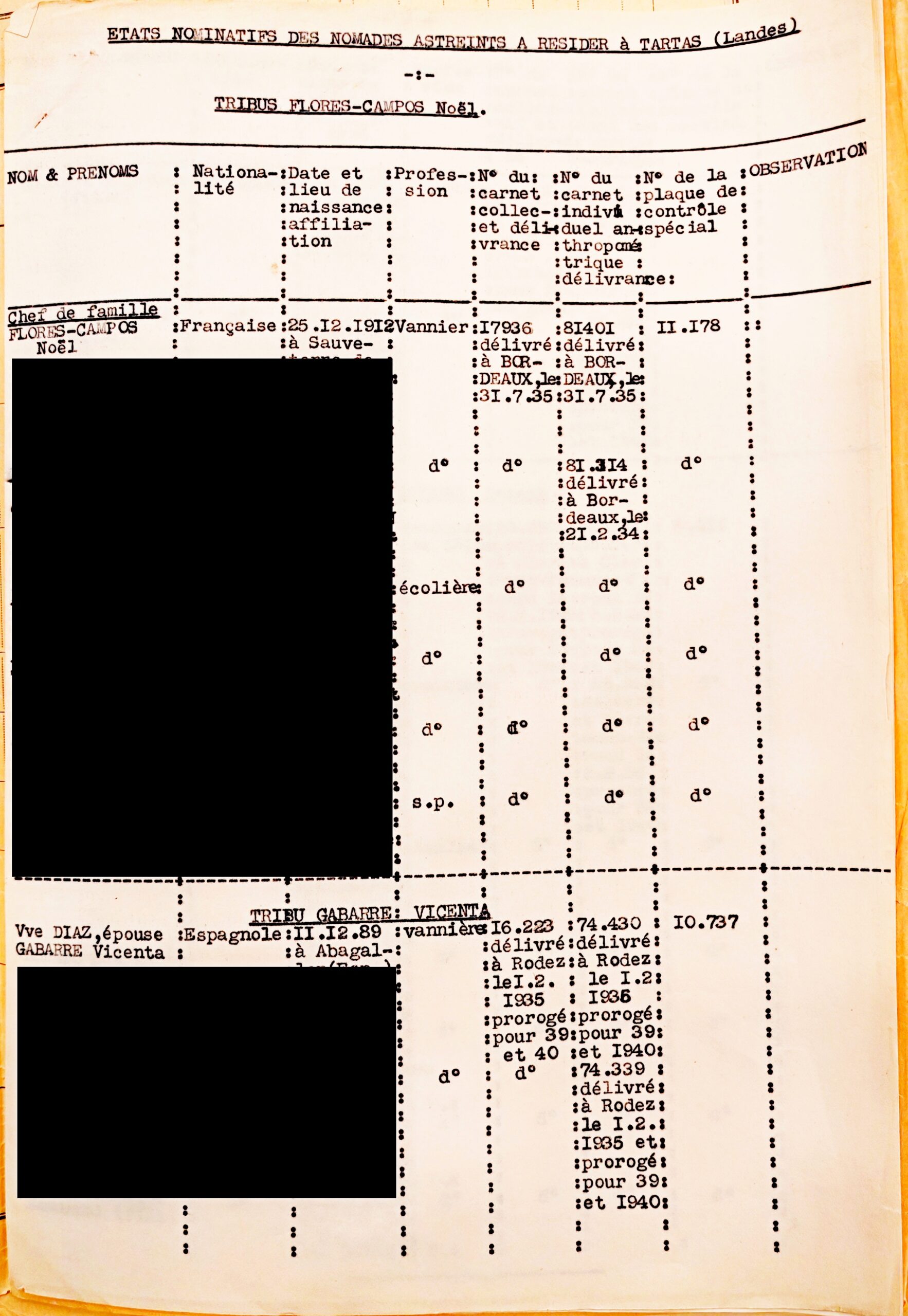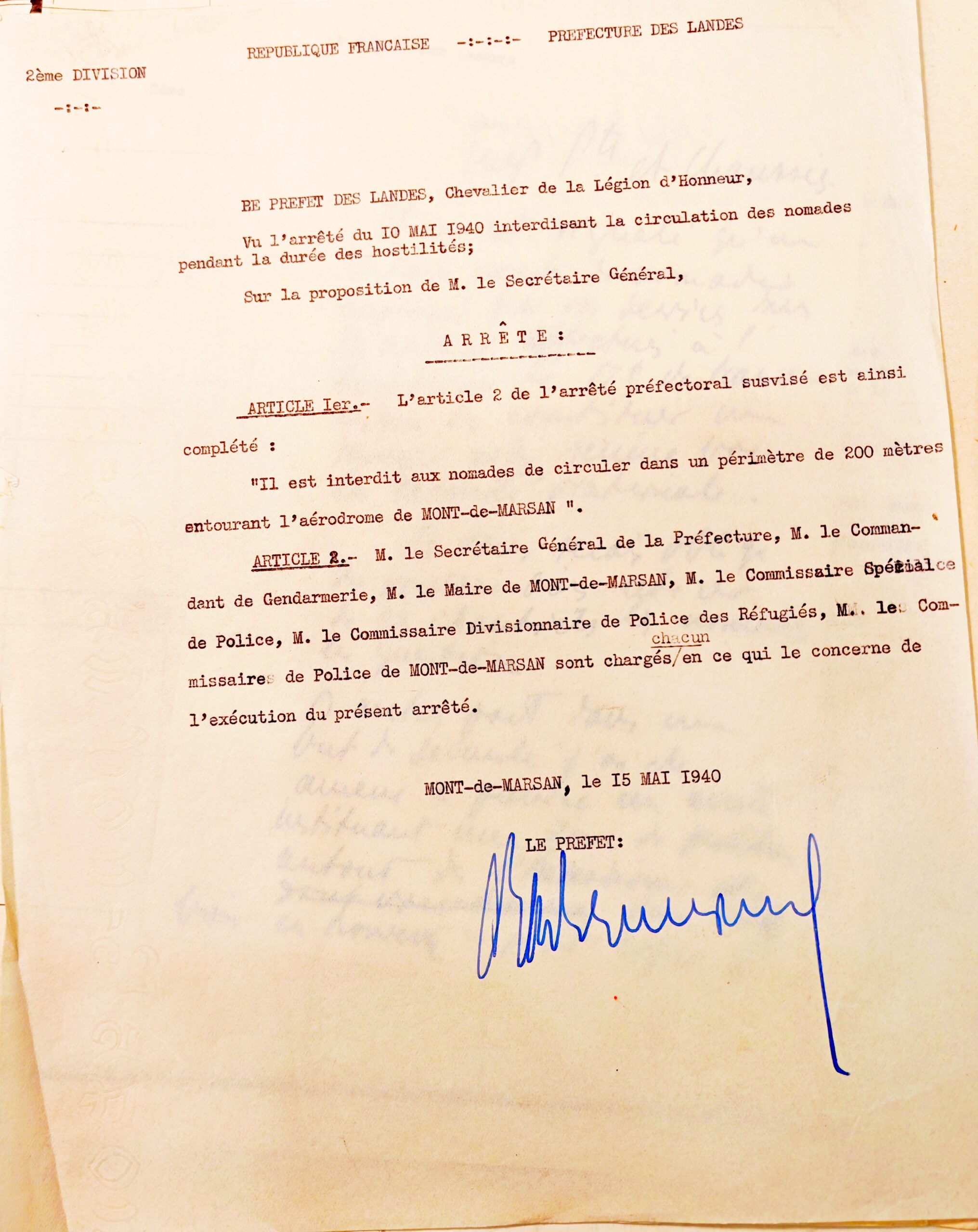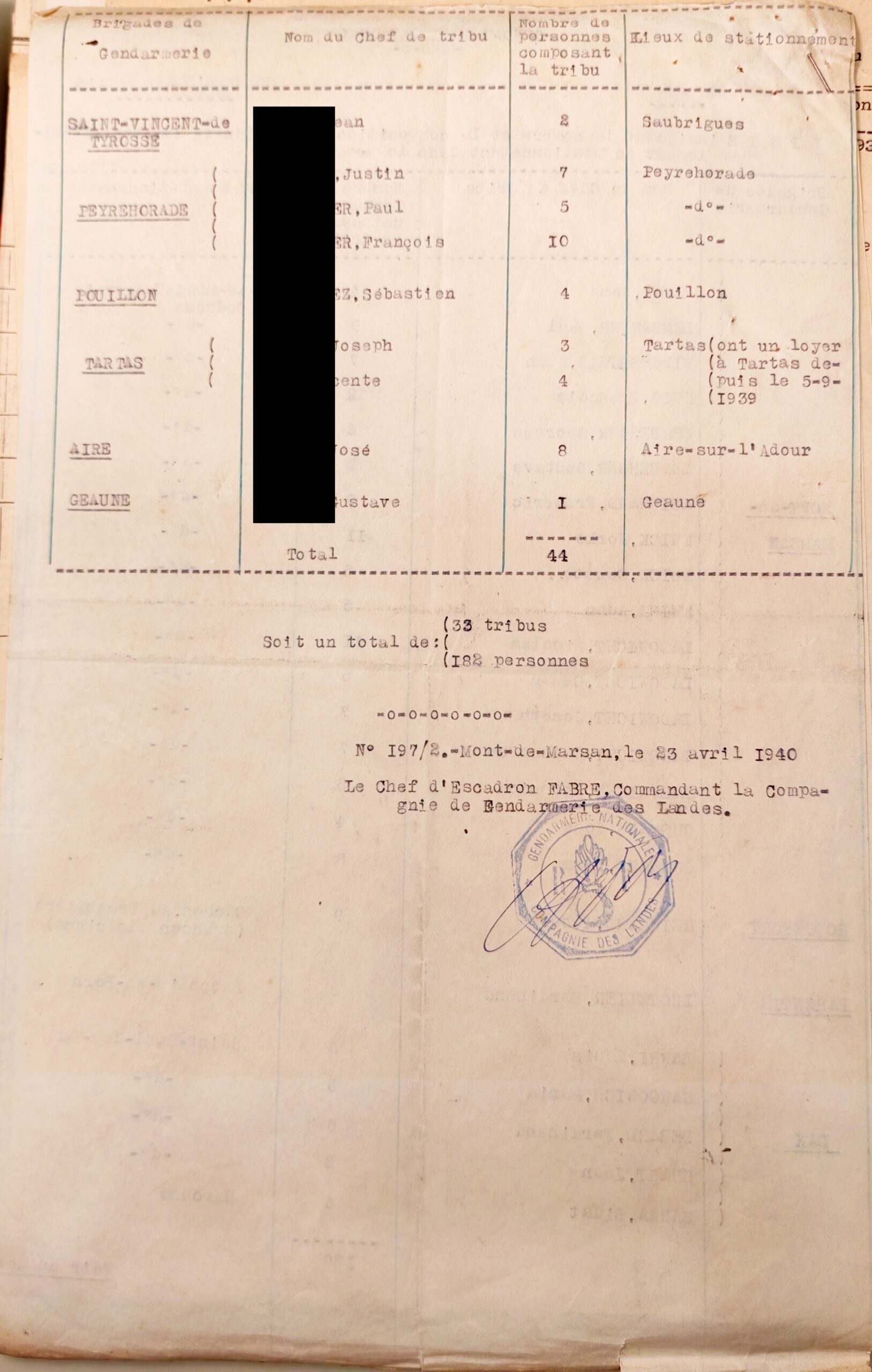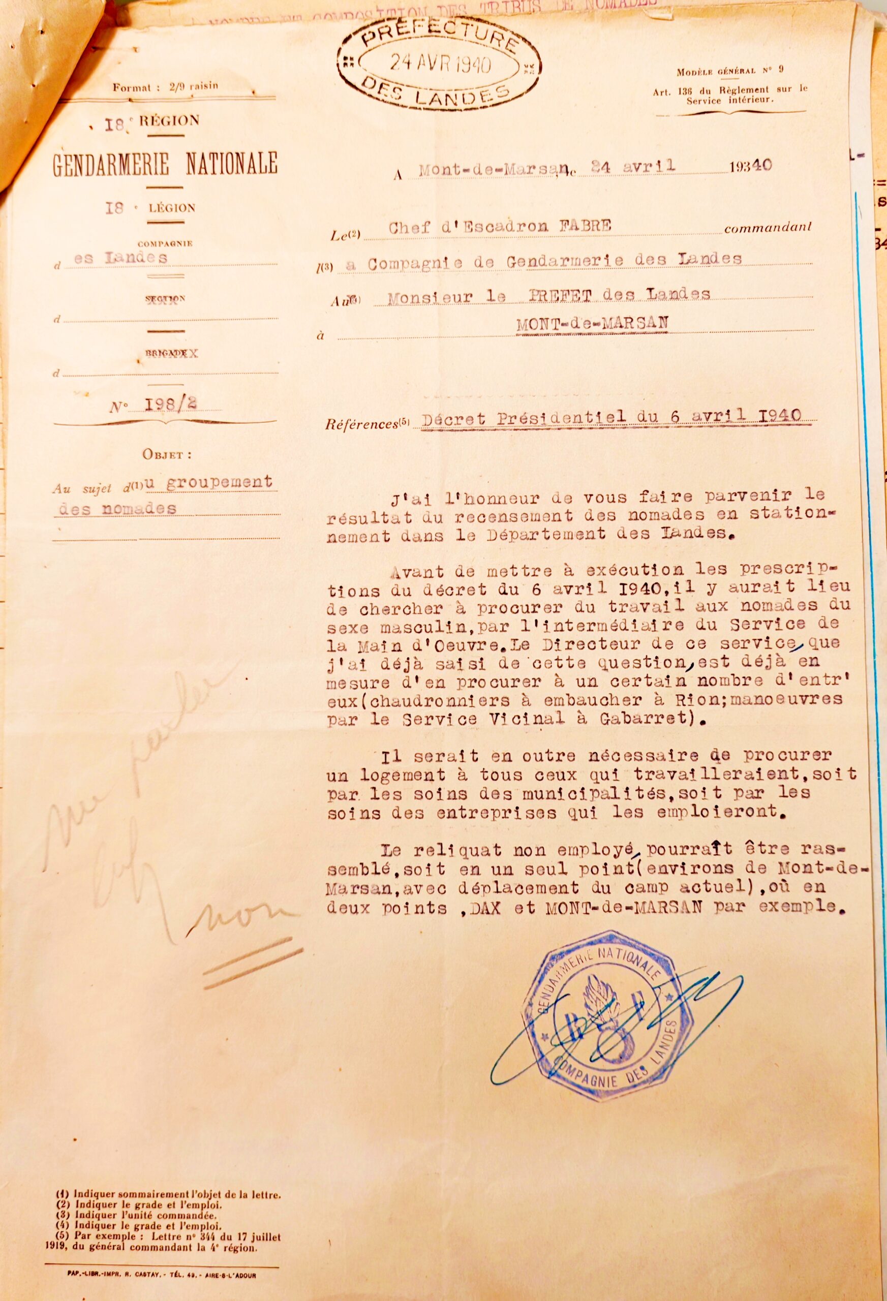 Dans les Landes, l’application du décret du 6 avril 1940 se traduit par des assignations à résidence dans les cantons où les nomades se trouvent alors. Ils sont également recensés : 182 personnes, réparties en 33 « tribus » (c’est le terme utilisé par les autorités), pour plus de la moitié stationnés à Mont-de-Marsan (Hippodrome), les autres essentiellement à Dax et Peyrehorade.