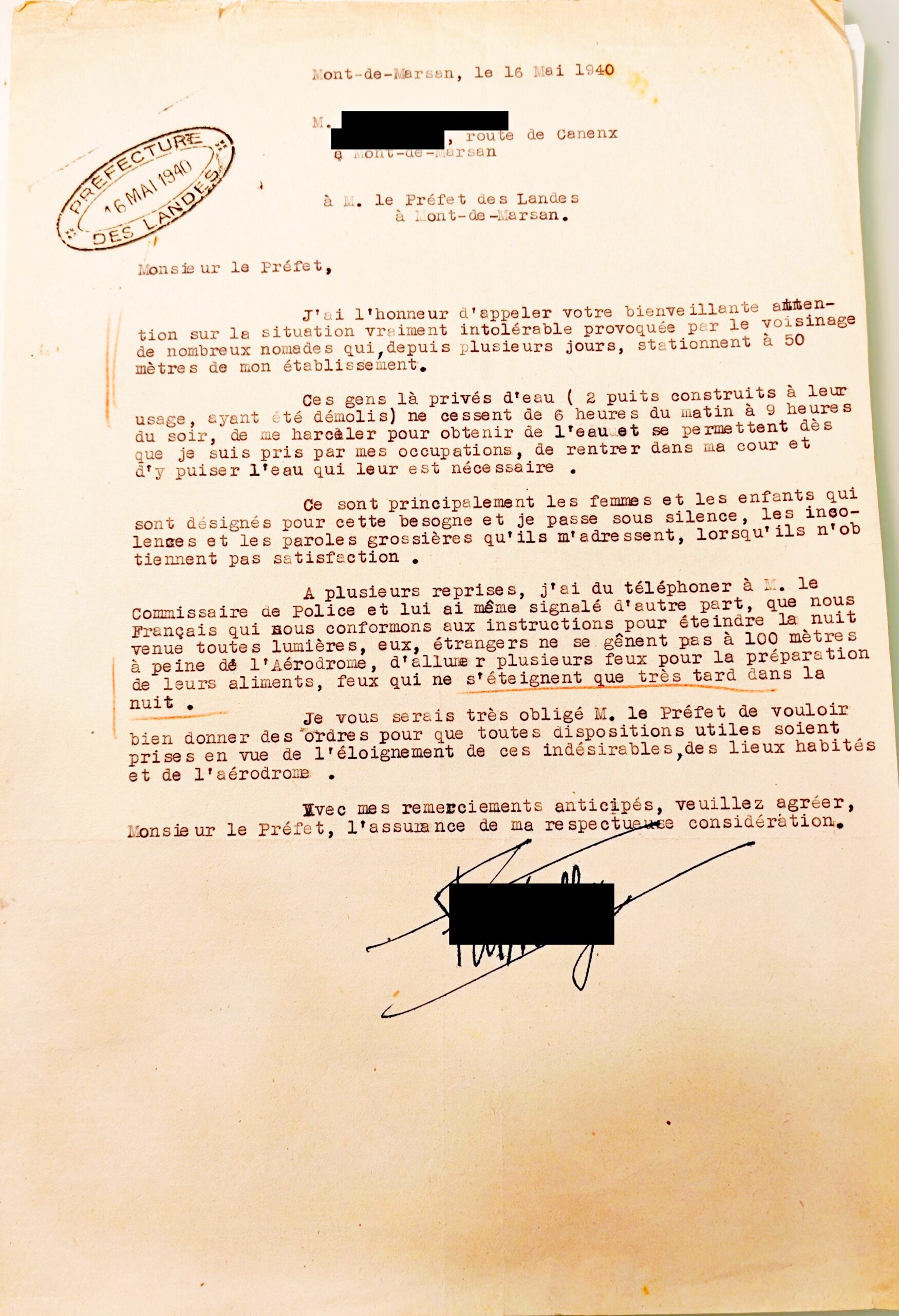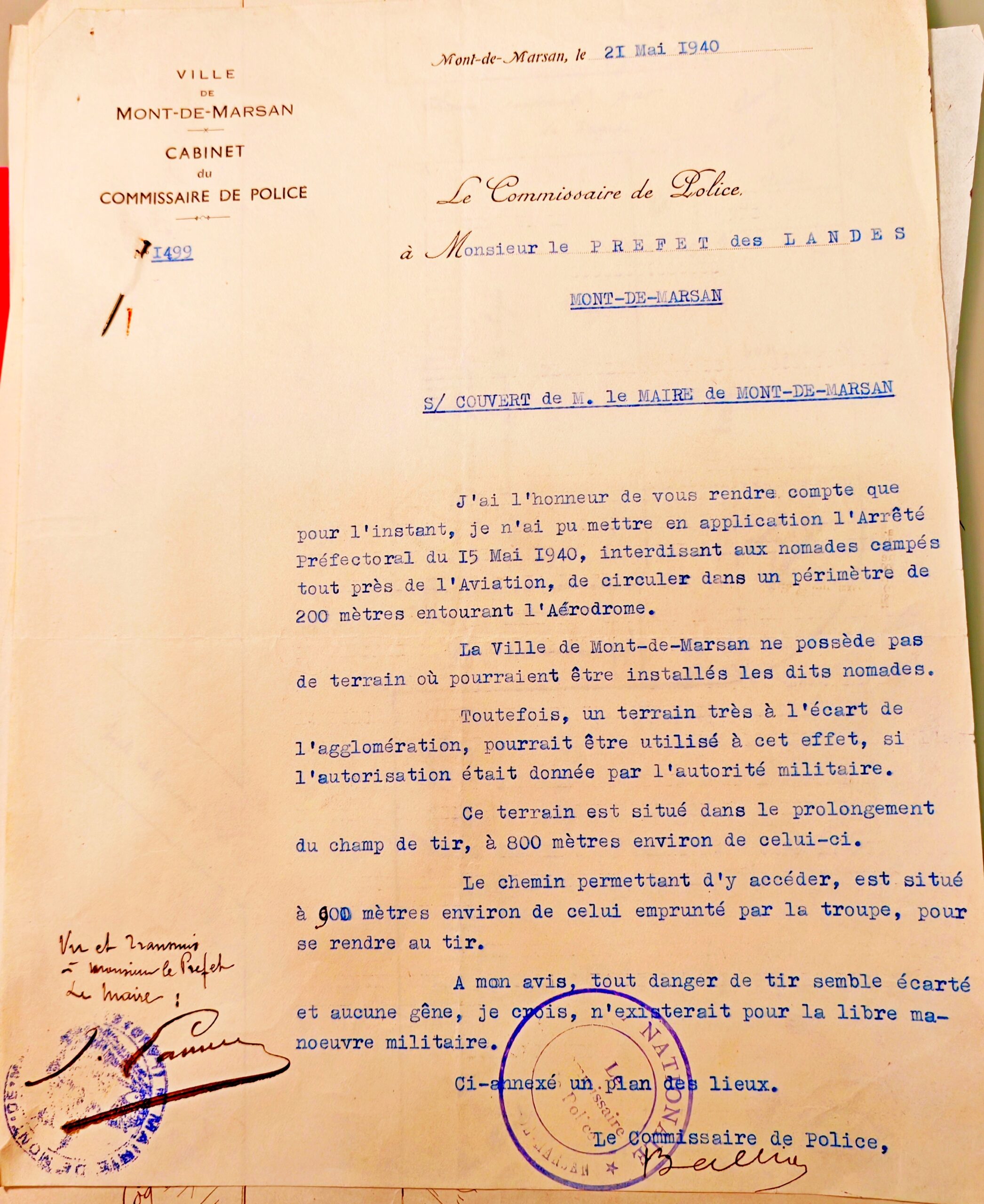 Ils sont plus que jamais indésirables, et les autorités militaires et le propriétaire des écuries proches de l’aérodrome de Mont-de-Marsan demandent aussi, pour des raisons différentes, à ce qu’on les éloigne. On envisage de les installer à côté des baraquements de réfugiés alsaciens à proximité d’un champ de tir utilisé par l’Armée (« à mon avis, tout danger de tir semble écarté » précise le Commissaire de police !).