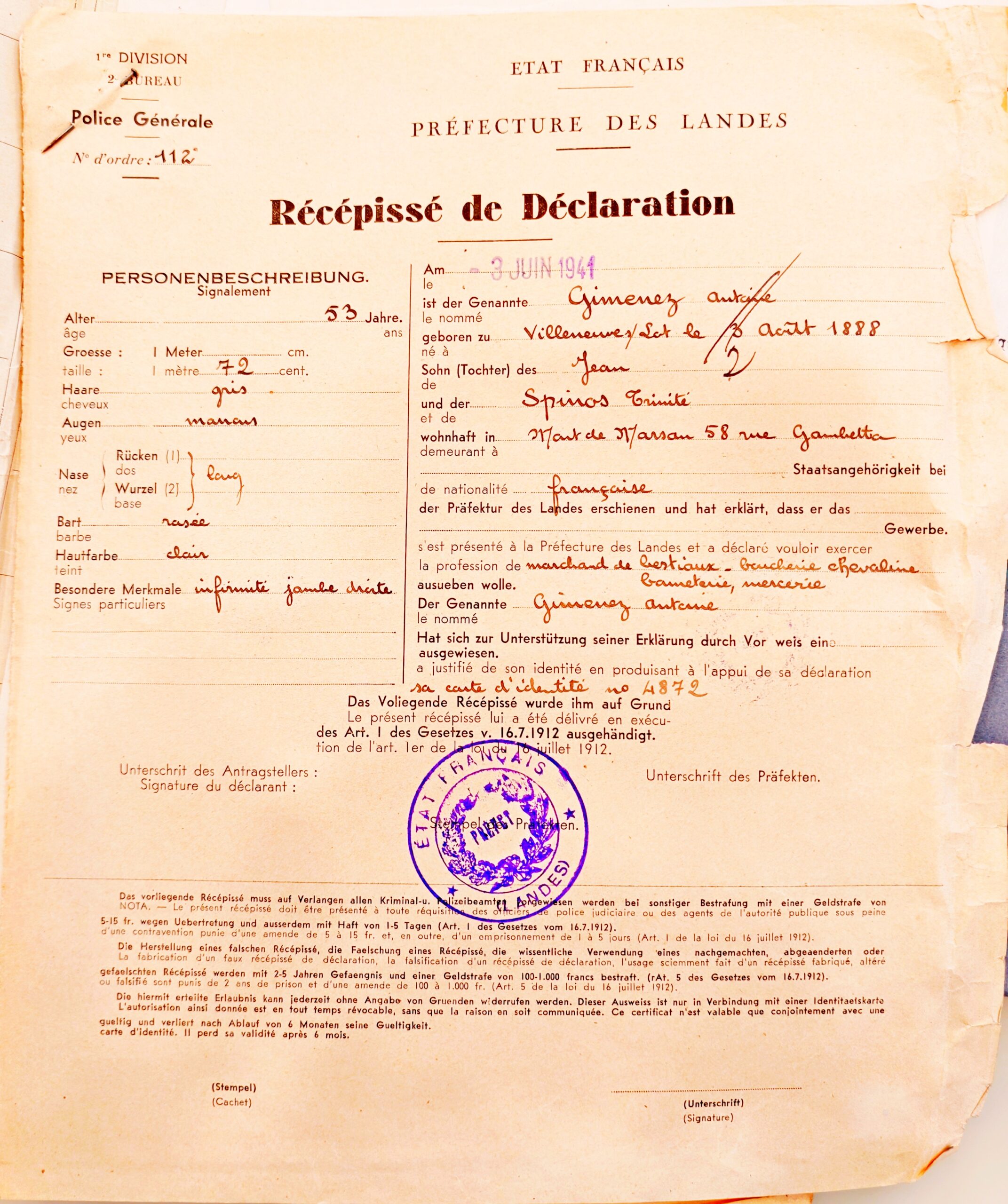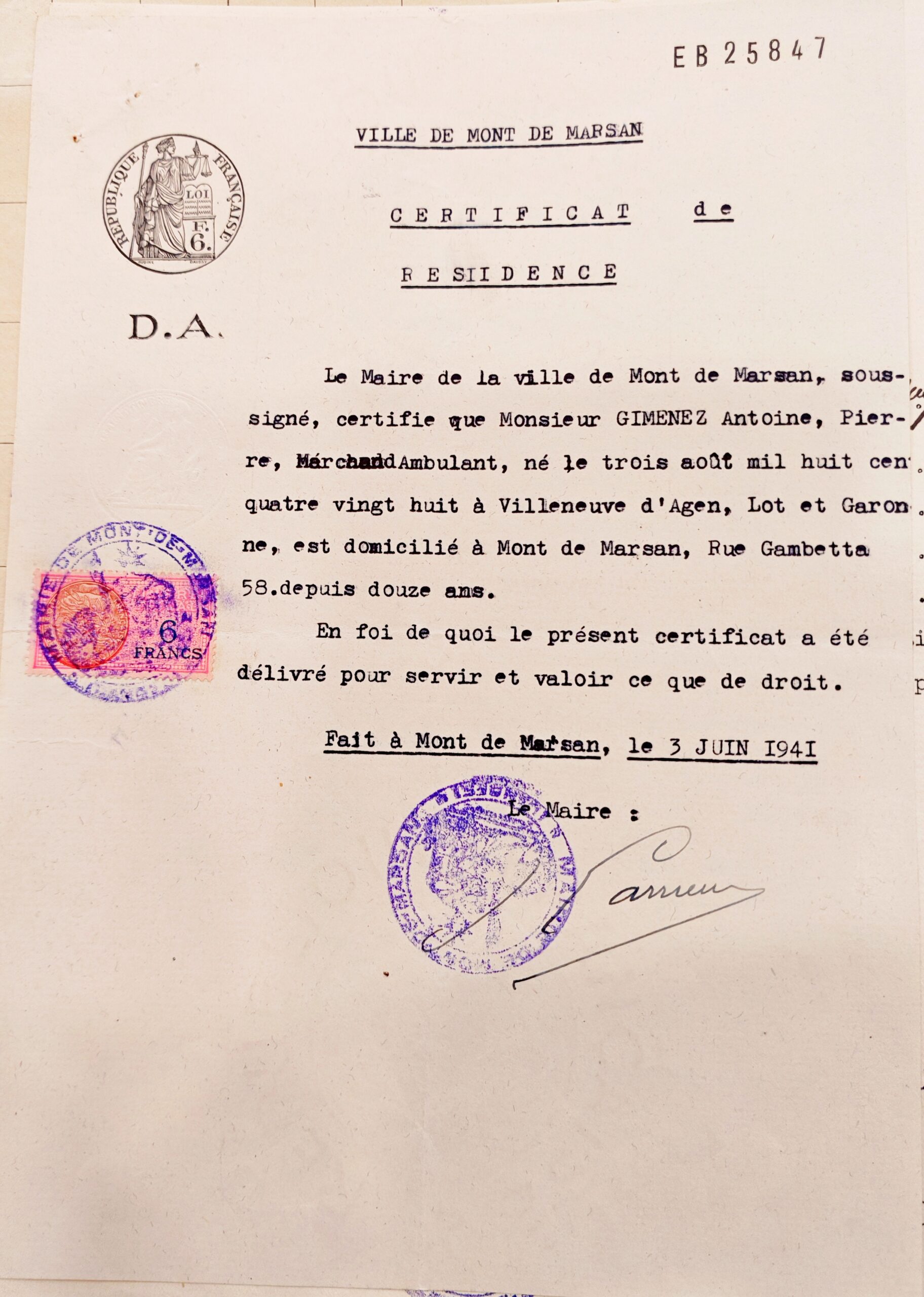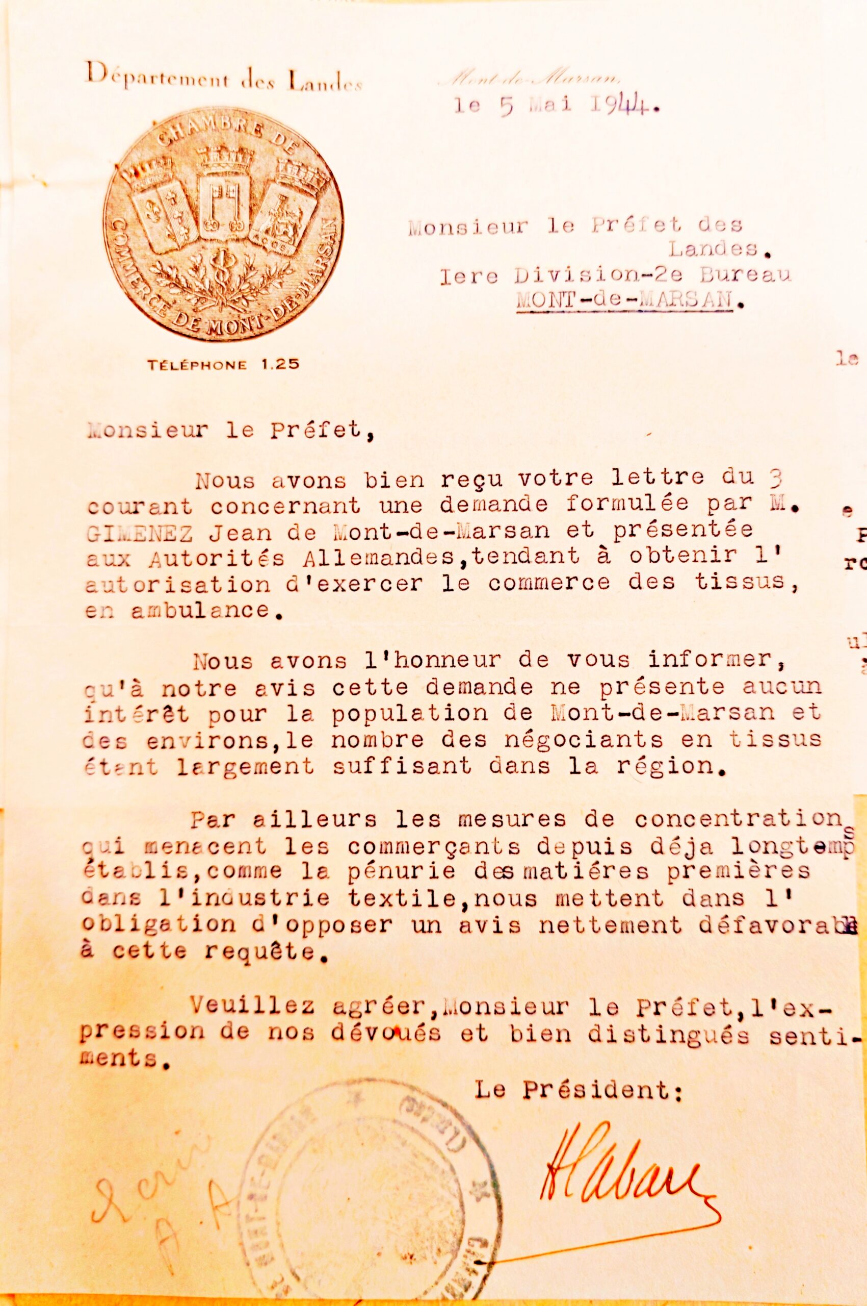 La cousine-germaine de Joseph épouse Pierre Antoine GIMENEZ (ou JIMENEZ), né en 1888 à Villeneuve-sur-Lot, domicilié pendant la guerre 58 rue Gambetta à Mont-de-Marsan (« depuis 12 ans »), qui demande à pouvoir exercer la profession de marchand de bestiaux, boucher, commerce ambulant de bonneterie et mercerie. Cependant, en 1944, le président de la chambre de commerce émet un avis défavorable.