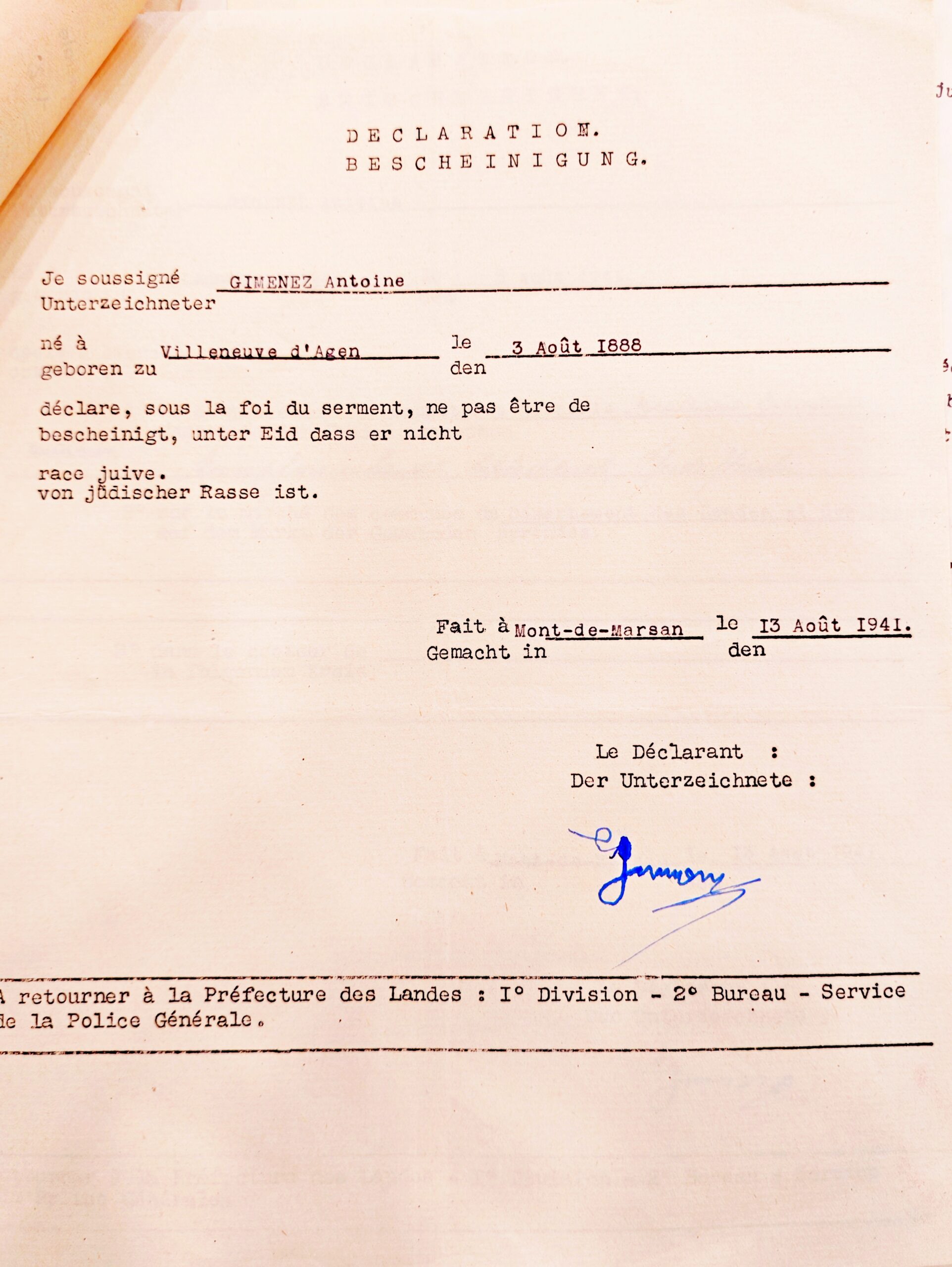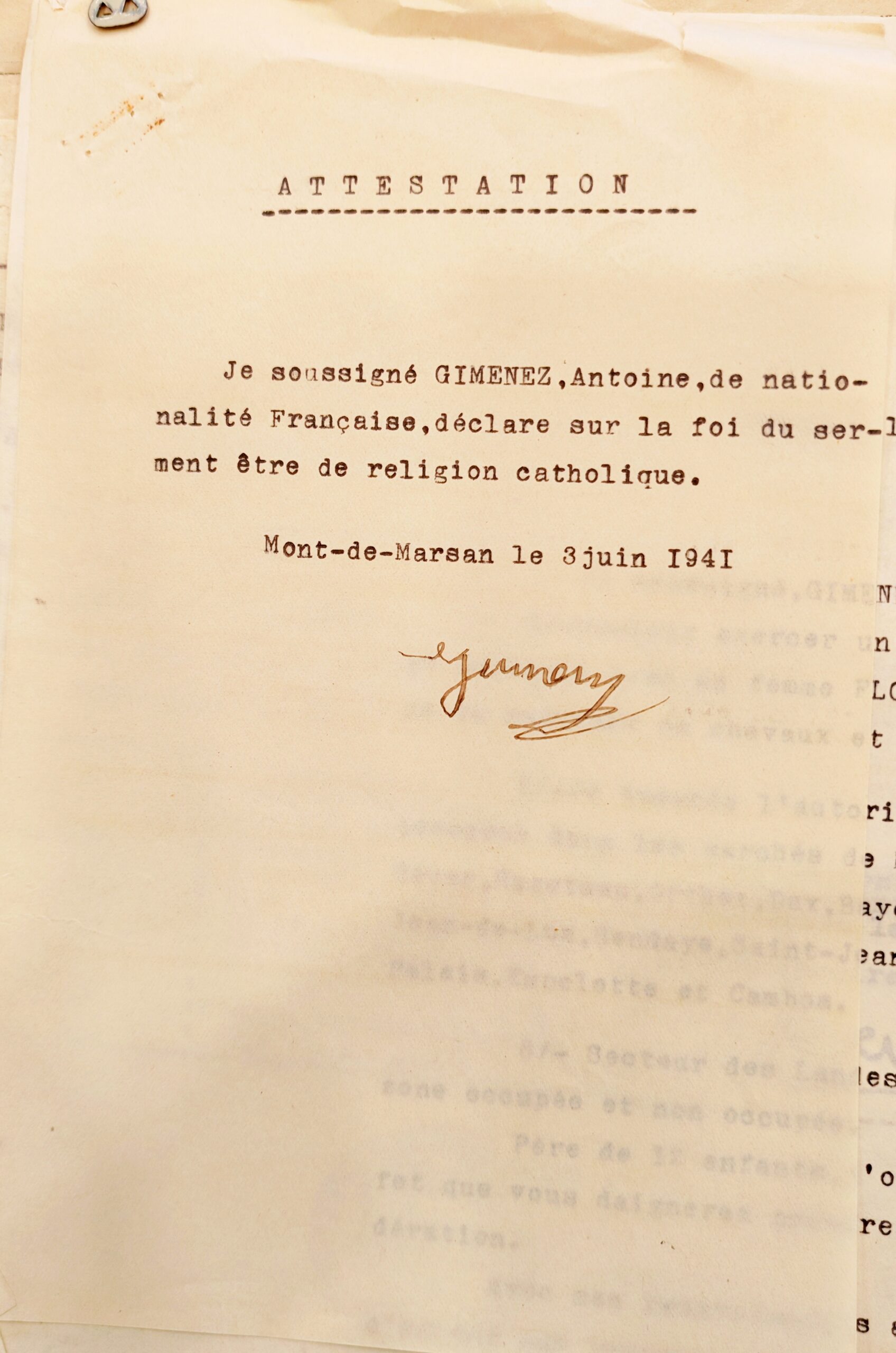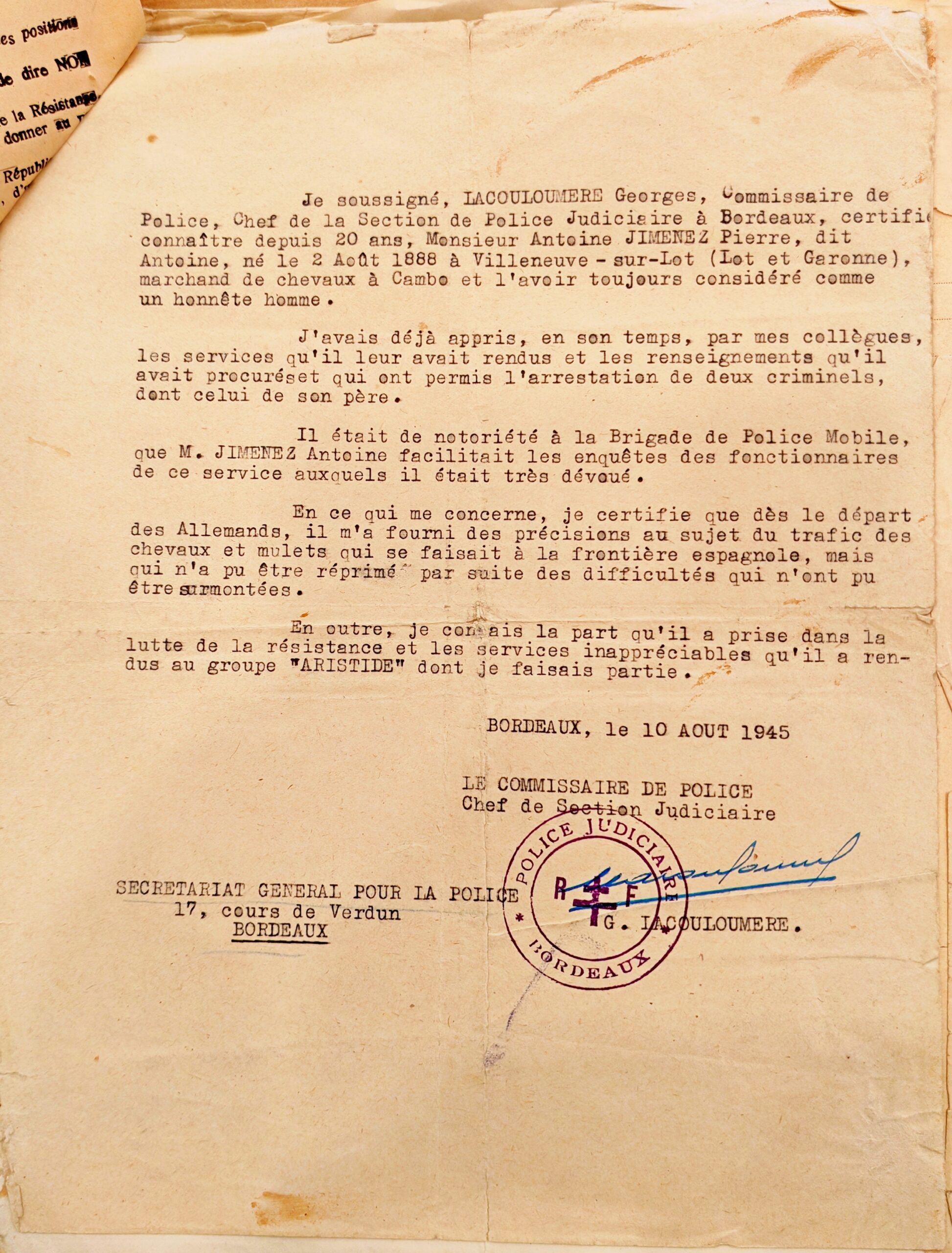 Un autre cousin, Jean GIMENEZ, né à Oloron en 1919, domicilié rue St-Pierre, est arrêté le 11 juin 1942 à Mont-de-Marsan pour avoir aidé des résistants et facilité le passage de la frontière à des jeune gens qui voulaient rejoindre les F.F.I.