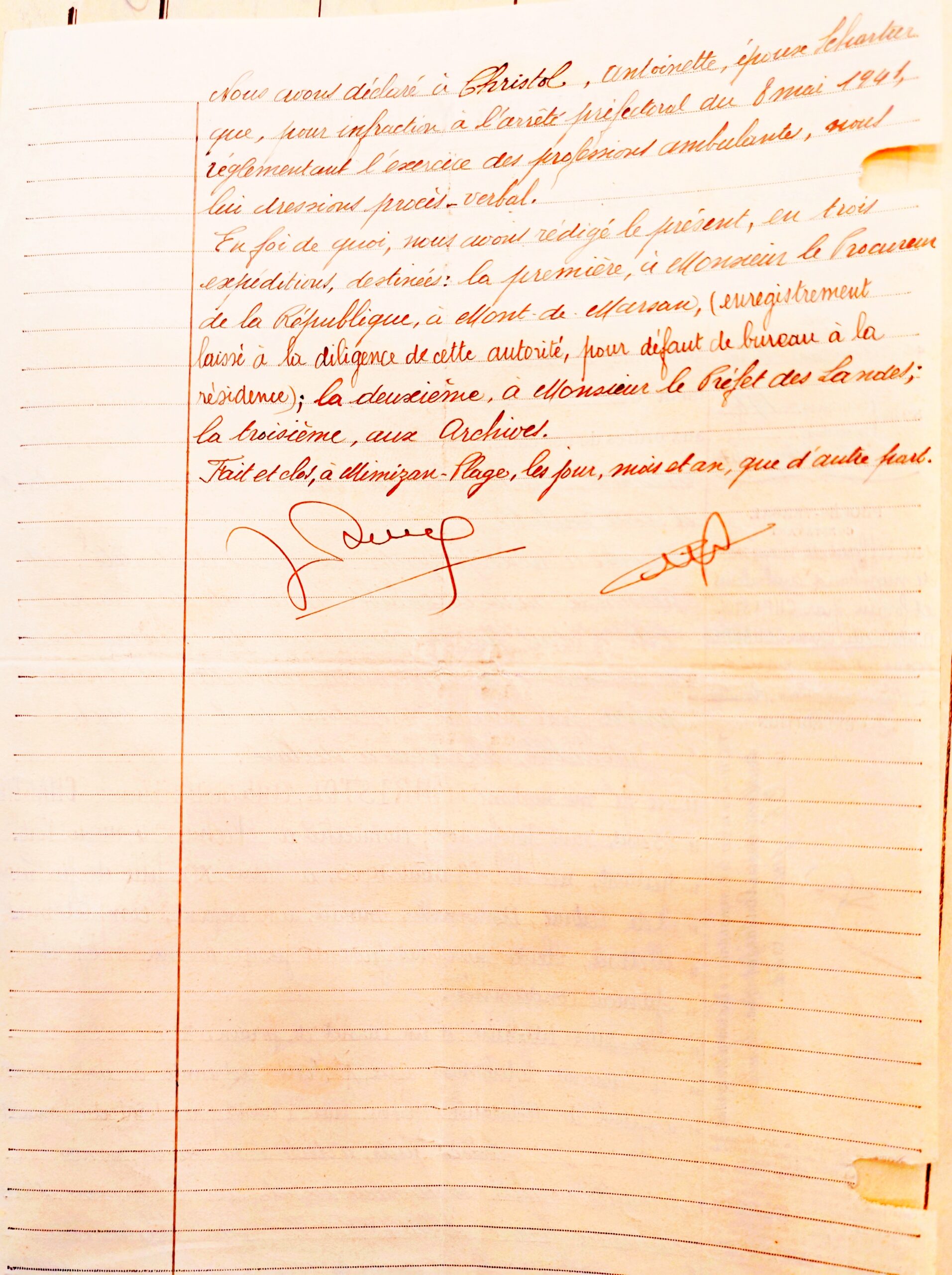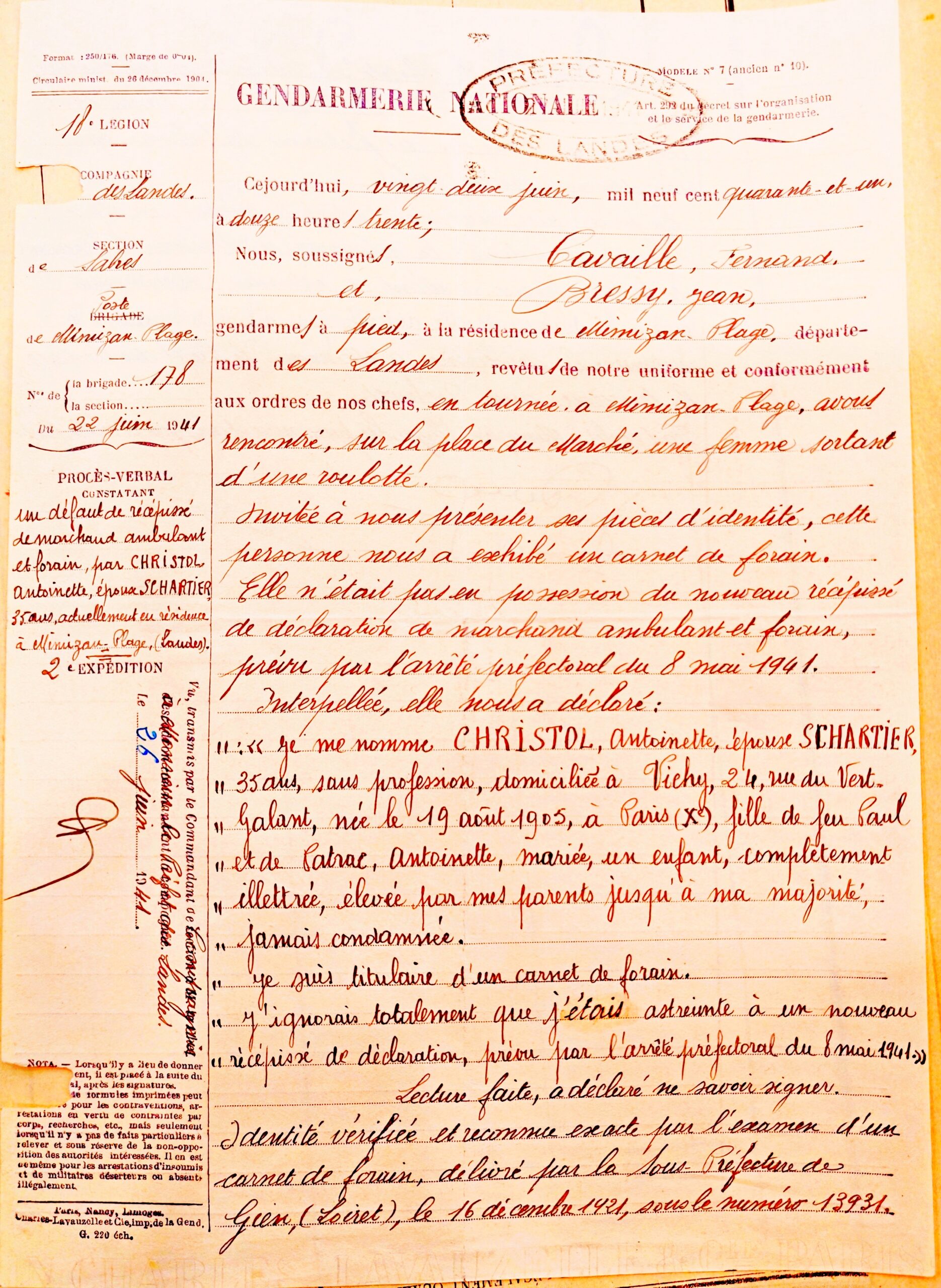 Ambulant tous mes papiers sont en règle monsieur le préfet, et suis à Mimizan depuis 9 mois environ ayant une roulotte auto, je ne puis me déplacer, et travaille ici au centre de carbonisation des Eaux et Forêts, et je satisfait (sic) également aux besoins de la population en tant que bricolage soudures etc.