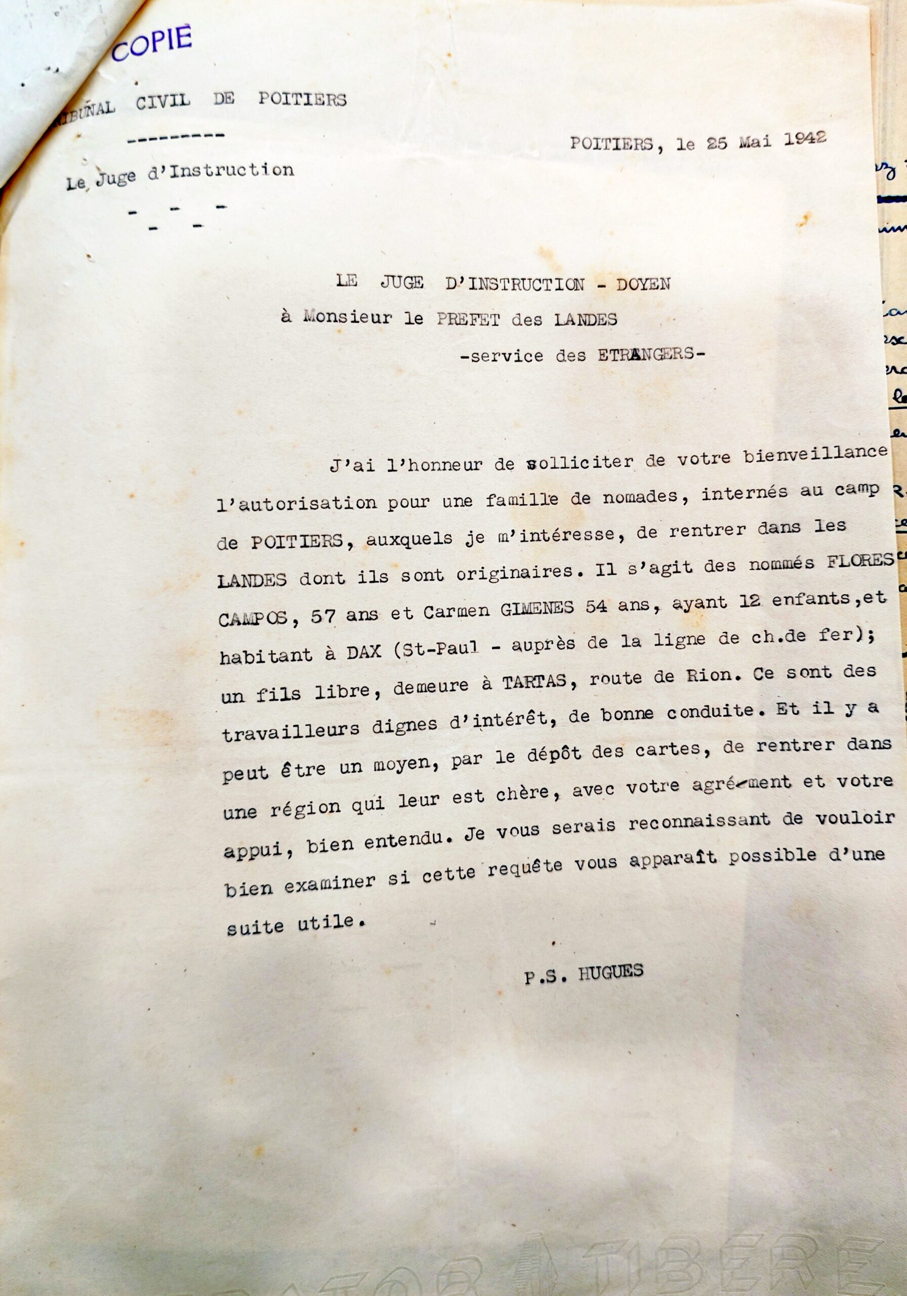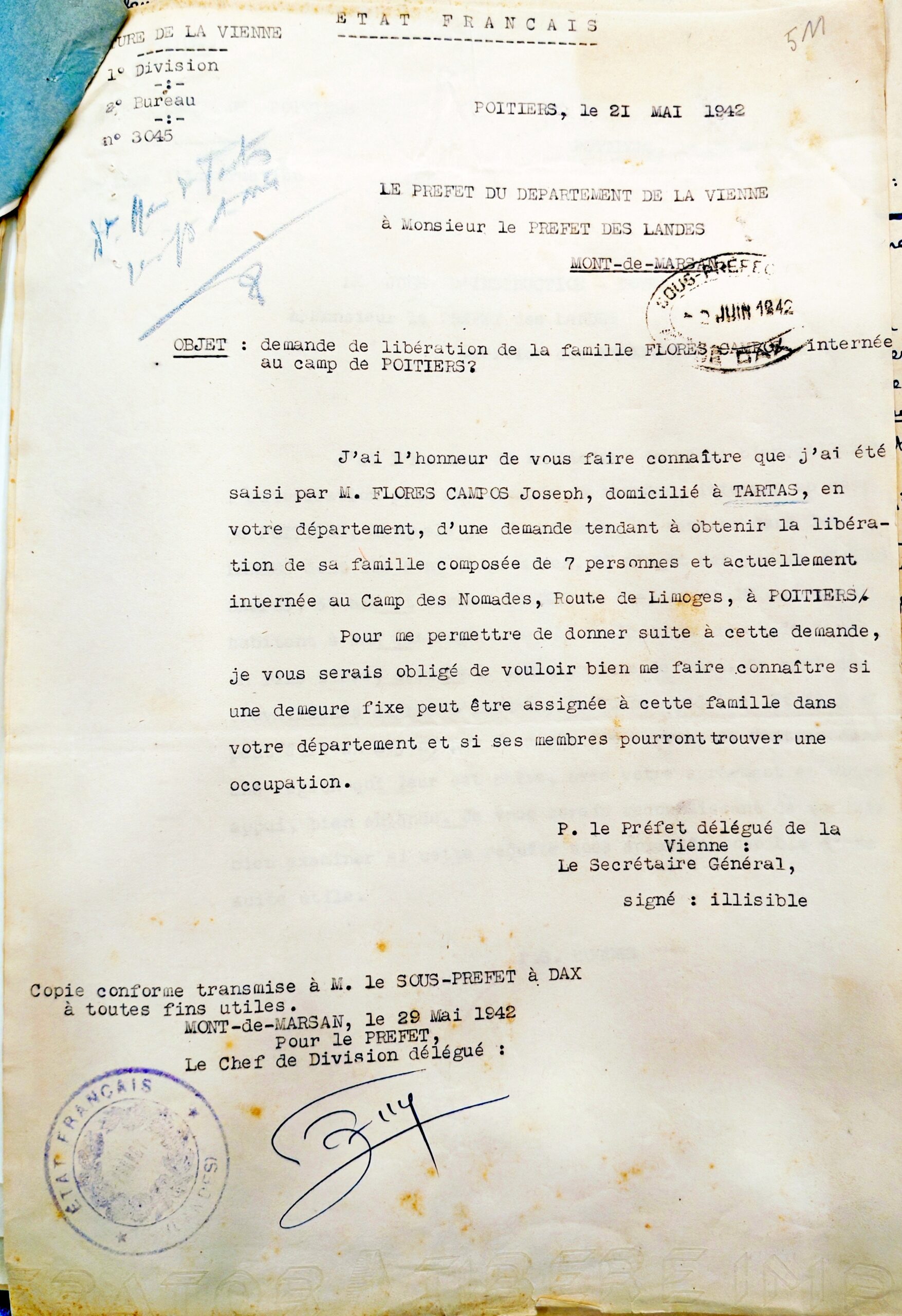 En mai 1942, Joseph Florés Campos, toujours interné, adresse une lettre au préfet de la Vienne pour obtenir la libération de sa famille et se rendre à Tartas. Le préfet de la Vienne demande à son collègue des Landes si « une demeure fixe peut être assignée à cette famille de sept personnes dans les Landes et si ses membres pourront trouver du travail ». Cette démarche est appuyée quelques jours plus tard par le juge d’instruction de Poitiers.