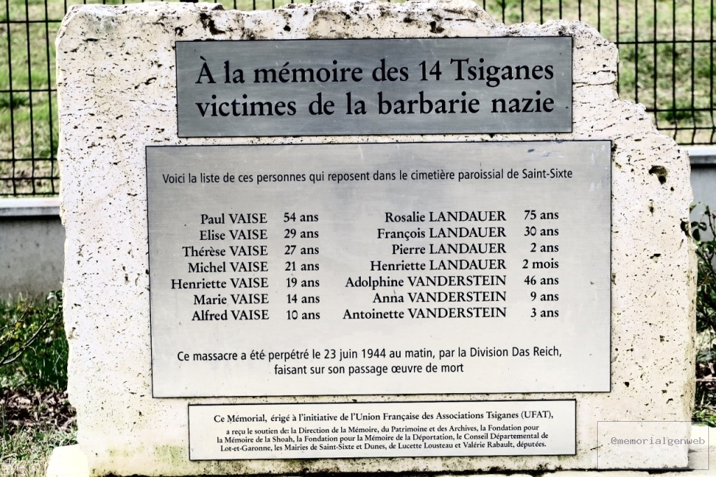 Pendant longtemps, une simple croix en bois a marqué le lieu du massacre. Une stèle fut érigée avant 1965 au lieu-dit Pourrou à Saint-Sixte (elle n’existe plus). Le 23 juin 1991, une nouvelle stèle a été réalisée, portant le texte suivant : «À la mémoire des Tziganes fusillés par les autorités allemandes le 23 juin 1944».