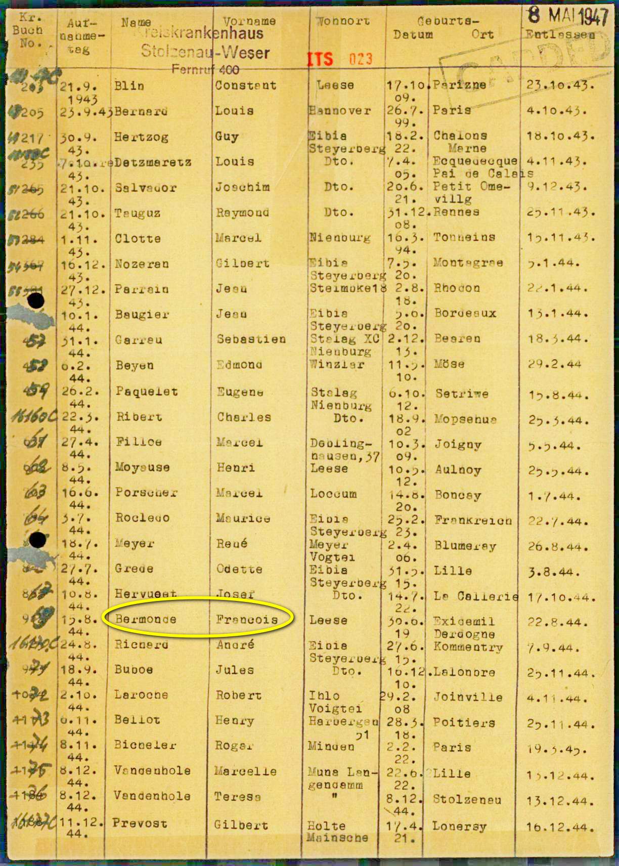 François BERMONDE est malgré tout déporté en Allemagne, employé dans l’usine Riedel de Haen à Leese (au sud de Hanovre, produits chimiques pour gaz toxiques, carburant pour V1 et V2…). Il est hospitalisé à l’hôpital de la ville voisine de Stolzenau du 15 au 22 août 1944. Il est employé par la firme Riedel de Haen jusqu’au 5 avril 1945 (la ville est alors libérée par les Anglais).