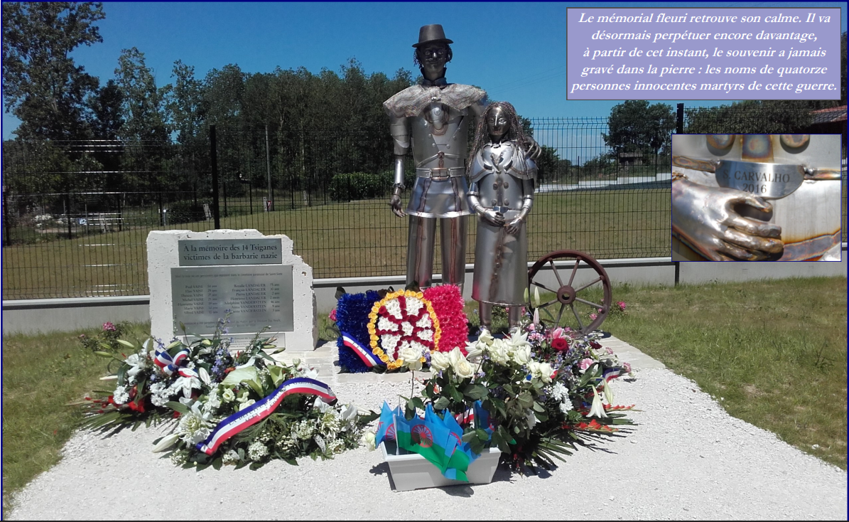 Le 23 juin 2016, grâce aux efforts persévérants d’Alain Daumas, président de l’Union française des associations de Tsiganes (UFAT), une œuvre et une nouvelle stèle sont inaugurées à quelques dizaines de mètres de la précédente. Ce monument a été le premier réalisé en France en hommage aux Tsiganes victimes de la barbarie nazie, quelques mois avant l’hommage national rendu par François Hollande aux nomades internés pendant la Seconde Guerre mondiale sur le site du camp de Montreuil-Bellay. La sculpture a été réalisée par l’artiste lot-et-garonnais Serge Carvalho, ancien professeur d’arts plastiques.