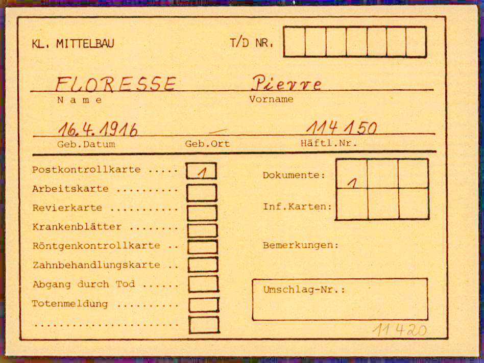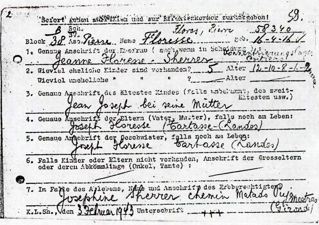 Pierre FLORES-CAMPOS est ensuite transféré à Ravensbrück (matricule 8430, « détenu politique français »), puis le 15 février 1945 (?) à Mittelbau/Dora (matricule 1141150, kommando de Nordhausen), et enfin Bergen-Belsen (enregistré sous le nom de Pierre FLORESSE et dit né le 16 avril 1916).