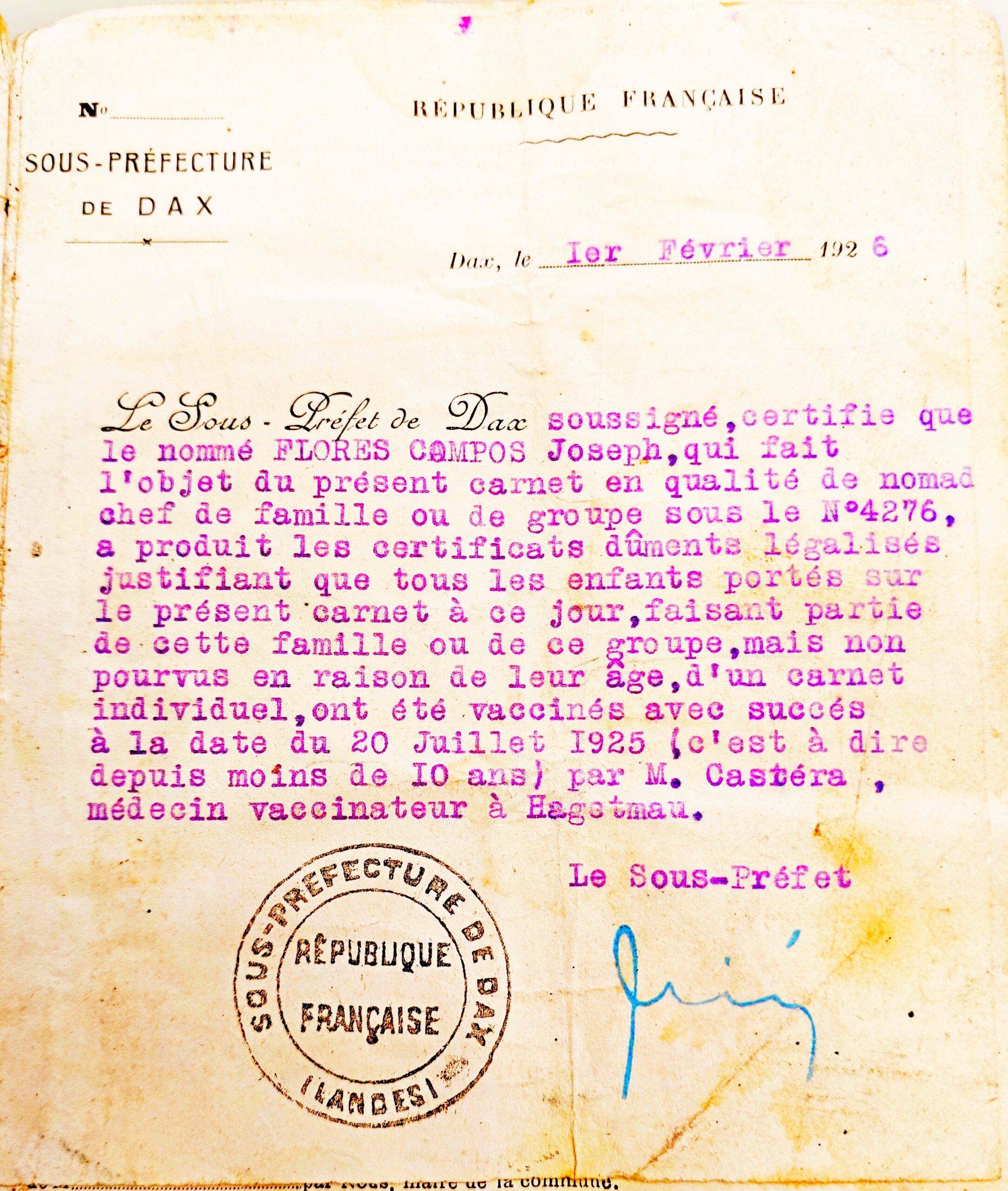 Un courrier daté du mois suivant nous informe que le sous-préfet de Dax, après avoir pris des renseignements auprès du maire de Tartas, fait connaître à la préfecture du département qu’il ne s’y oppose pas sachant que le fils aîné de Joseph Florès Campos possède un logement libre à Tartas et qu’il se charge de subvenir à leurs besoins. Faute de documents, nous ignorons si la requête de ce dernier a abouti, mais une démarche identique pour Rose WINTERSTEIN et ses enfants, avec certificat d’hébergement par Joseph FLORES CAMPOS, est restée sans succès.