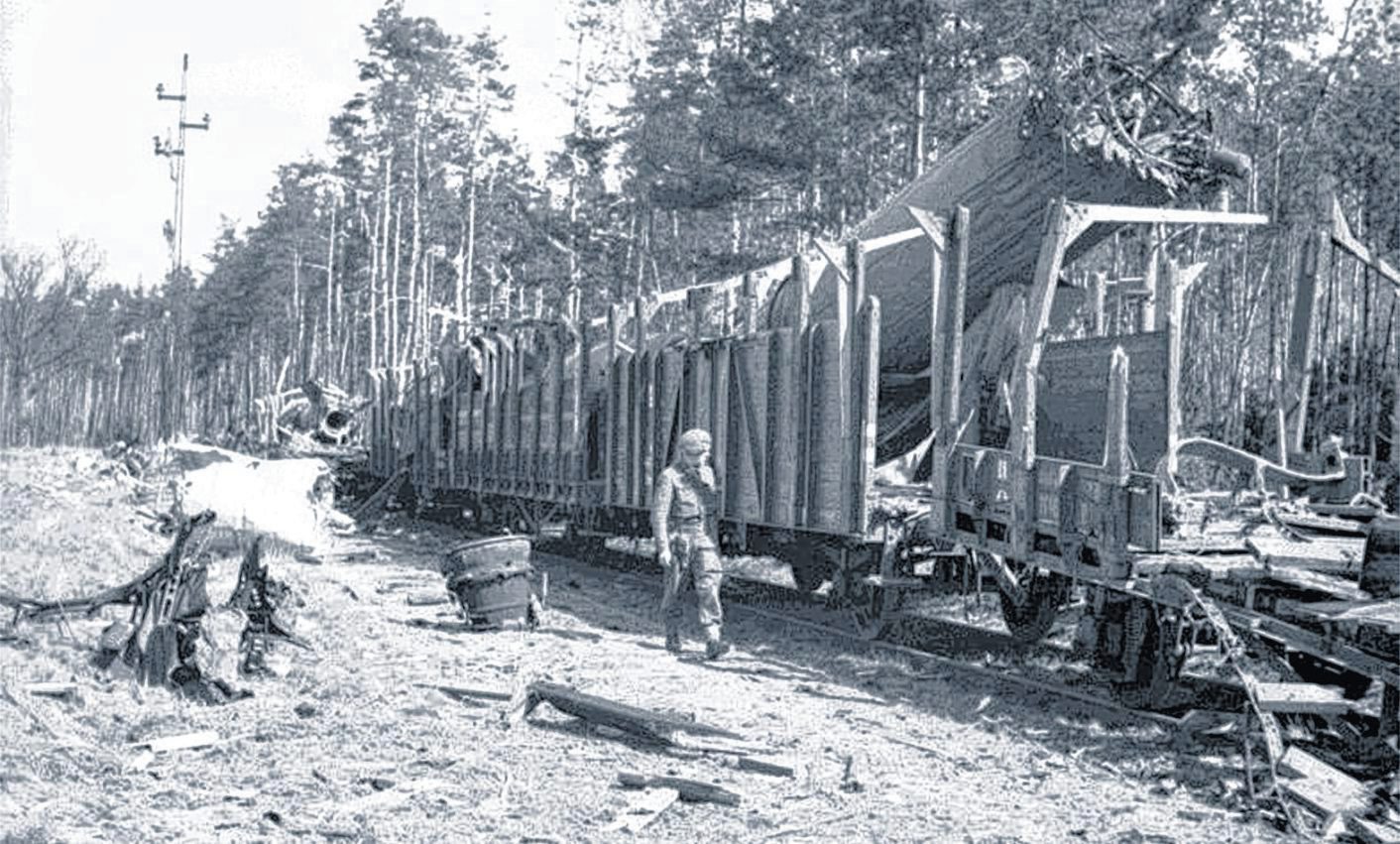 Les SS marchent prudemment en colonne sur le bas-côté de la route. Les fils électriques et du téléphone sont coupés.